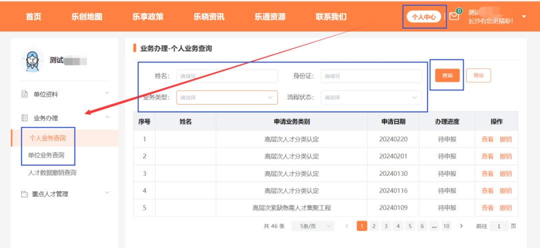 申报成功后,点击右上角个人中心-> 业务办理 -> 个人业务查询 了解您申报各类研发人才认定业务的最新进度。