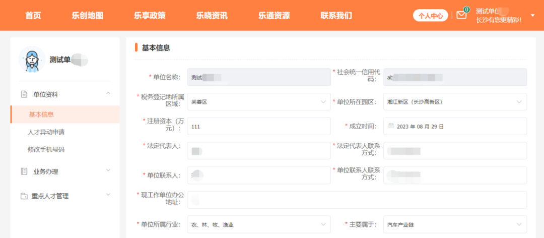 企业访问长沙人才智慧导航 -> 个人中心 -> 单位资料,完善基本信息。