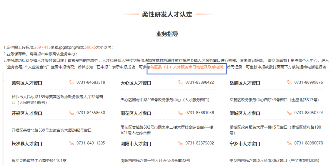 在申报界面 -> 业务指导中也有各区县(市)园区人才窗口信息: