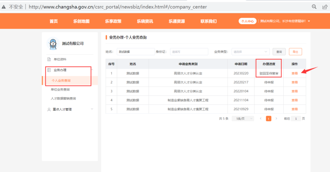 对于研发人才认定类业务,若需补充材料(审核状态为“驳回至待复审”),登录单位账号点击右上角个人中心-> 业务办理 ->个人业务查询 找到驳回至待复审那条数据,点击查看进入申报界面。