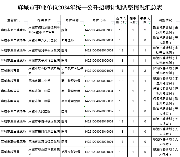 根据《麻城市事业单位2024年统一公开招聘工作人员公告》,由于部分岗位未达到开考比例,经招聘单位及其主管部门申请,市招聘工作主管部门批准:取消10个岗位的招聘计划,降低3个岗位的开考比例保留招聘计划予以开考,详情见附件。(《麻城市事业单位2024年统一公开招聘计划调整情况汇总表》)。 已报名确认及缴费但招聘岗位取消的报考人员,接到招聘单位通知后,可于3月6日12:00前改报其他岗位。期间相关报考人员因条件不符未成功改报其他岗位,以及无法正常联系或接到通知后未改报的,视作放弃改报权利,退还已缴费用。