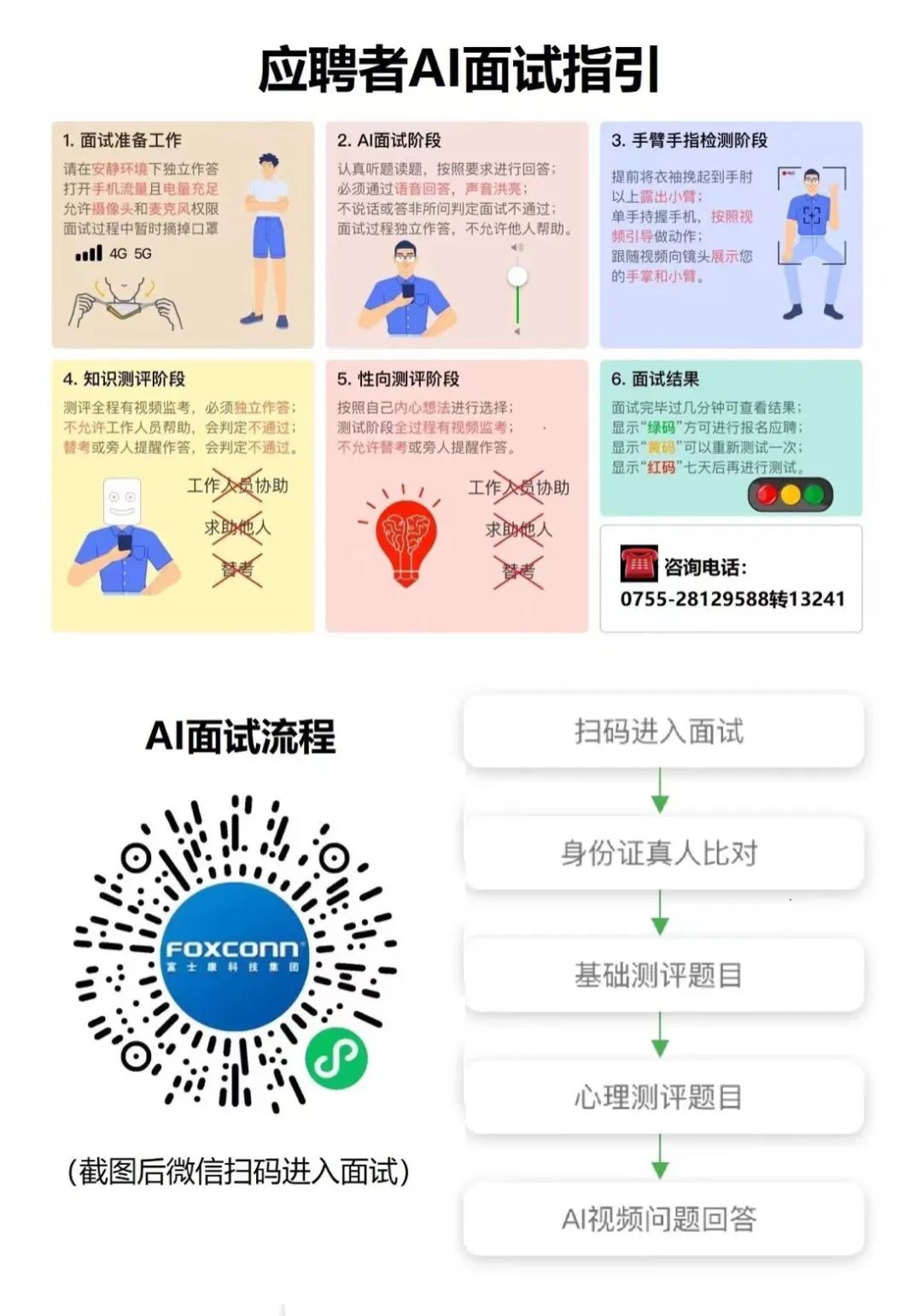 深圳富士康iPEBG富联裕展正式工,主要生产苹果手机,无体力活空调车间坐班,工作轻松,公司提供吃住,年龄18-44岁即可! 系统审核通过后会以短信形式发送(面试日期)通知前往面试中心,“提前前往面试中心不享受激励政策”。 扫描海报二维码,选择【观澜厂区招募】或【龙华厂区招募】进行报名,关注“富联裕展普工招募”公众号 内部推荐是线上扫码填表报名,不支持线下报名,系统审核通过后会以短信形式发送(面试日期)通知前往面试。 以短信通知为准,线上AI面试时间为:7:00-23:30之间皆可面试 ①AI面试(按指示一步步操作即可),面试地点不限,可在家面试。 注意事项:面试完几分钟即可查看结果 显示“绿码”方可进行报名应聘 显示“黄码”可重新测试一次 显示“红码”七天后再进行测试 AI面试过了之后,收到初审通过的短信即可前往招募中心(直接刷身份证进入)进入下一步流程