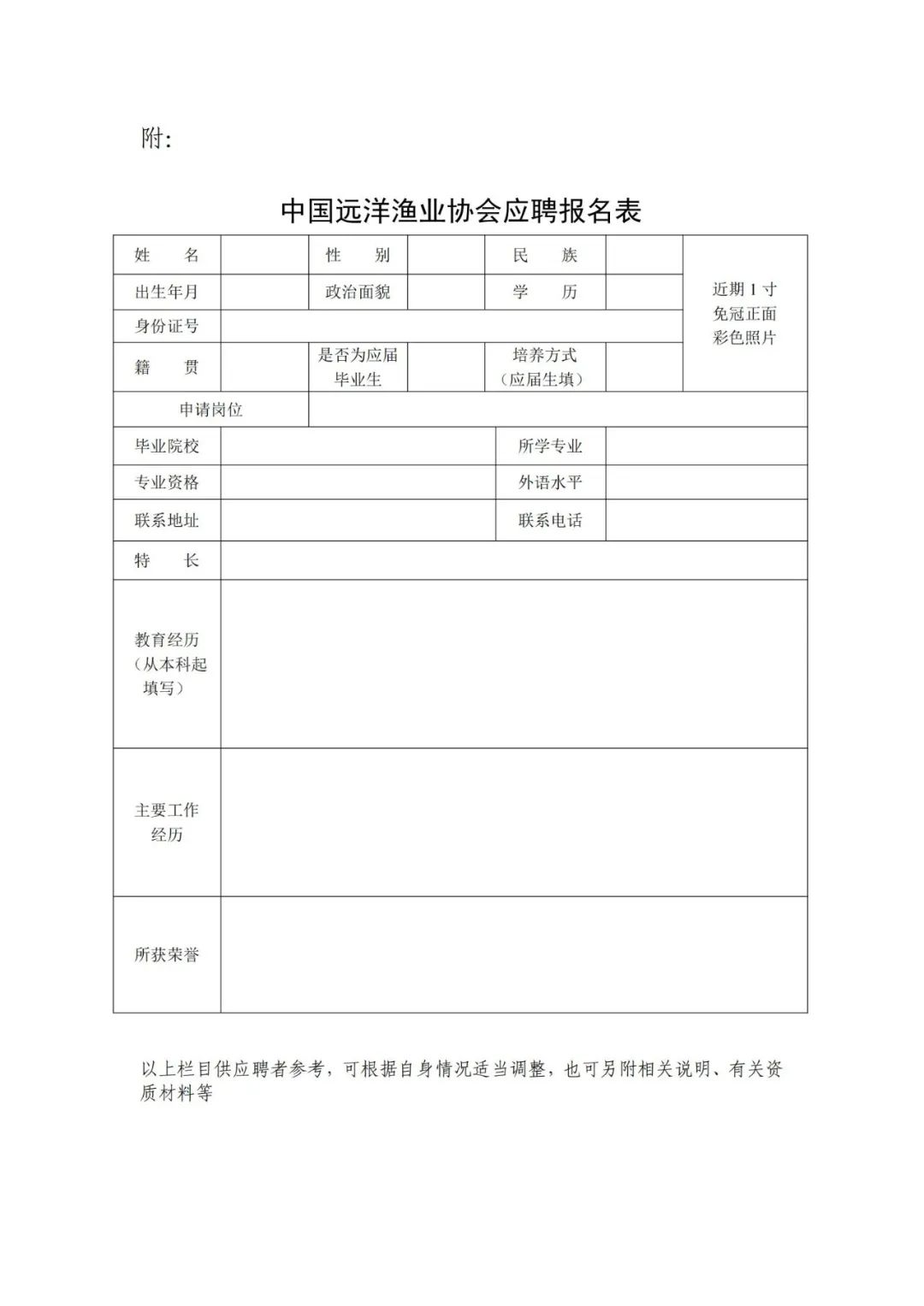 中国远洋渔业协会会标 ![]() 01 招聘基本条件 (一)具有中华人民共和国国籍; (二)遵纪守法,思想政治立场坚定,品行端正,作风正派,廉洁自律,纪律观念强,热爱三农工作,不存在《公务员录用规定》中不可报考公务员的情形; (三)身心健康,爱岗敬业,踏实勤勉,诚实守信,有较强的工作责任心、团队协作精神和服务意识; (四)工作积极主动,执行力和沟通能力强,有较强的学习和独立思考能力且抗压能力强; (五)工作严谨细致,具有较强的数据和信息安全意识; (六)具备拟招聘岗位所需的学历、专业和技能条件及其他招聘要求(条件特别优秀或经验特别丰富者可放宽其他条件)。 02 招聘职位及任职条件 ![]() 综合部职员( 1人 ) 任职条岗位职责件: 岗位职责: (1)负责协会信息平台的日常运维; (2)参与协会信息化建设的规划、设计及建设; (3)负责远洋渔船船位监测日常事务性工作及相关工作; (4)负责秘书处办公电子设备等检验、维护,提出专业建议; (5)相关工作文件起草,报告、总结等材料撰写; (6)承担综合部部分日常工作; (7)完成秘书处安排的其他工作。 ![]() 业务部门职员( 3人 ) 任职条件: ![]() 财务主管( 1人 ) 任职条件: ![]() 03 薪资待遇 (一)薪资待遇根据我会相关规定执行。除享受国家规定的五险一金以外,按规定享受补充医疗保险、意外保险和企业年金; (四)工作地点:北京 04 报名方式及招聘流程 (一) 有意者请于2024年4月30日前,将个人简历,学历证书、有关证明、身份证等复印件以及应聘报名表(后附),以电子邮件形式发送至邮箱:zonghebu@cofa.net.cn(请标明邮件主题为“应聘-应聘职位-姓名”); (二) 初审合格者通知面试。初次面试通过者于30天内通知复试,未通过初试者不再另行通知; (三) 联系电话:010-65850652,18511770557 ![]() ![]() ![]() ![]() 来源:中国远洋渔业协会