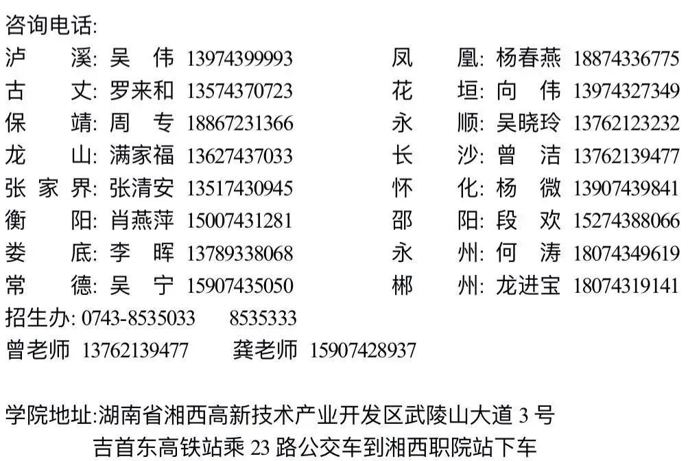 办学性质:全日制公办大学 办学类型:普通高等教育 办学层次:高职专科 奖助学金政策 1、学校为品学兼优学生提供:国家奖学金,奖励金额8000元/年;国家励志奖学金,奖励金额5000元/年;智育奖学金,一等2000元/年、二等1600元/年、三等1200元/年; 2、学校为家庭经济困难学生提供:国家助学金,一等4400元/年、二等3300元/年、三等2200元/年;为弘扬中华民族扶贫帮困的社会风尚,学校党委成立了爱心助学基金,帮助贫困学生完成学业,困难学生也可以参加学校组织的勤工助学。 3、家庭经济条件困难的学生可以申请国家生源地无息助学贷款。 ![]() 备注:根据省教育厅政策规定,体育特长生、退役军人为单列计划,单列计划纳入我校单招总计划,且均包含在各相关专业的招生计划内,未录满的计划自动转为普通类计划。 1、退役军人计划25人,考生可在上表指定计划数专业范围内自行选择报考,但每个专业最多录取1人。 2、体育特长生招生计划25人,考生可在上表指定计划数单招专业范围内自行选择报考专业,但每个专业最多录取特长生1人。 ![]() 一、报名对象:符合我省2024年普通高考(含对口招生考试)报名条件并已参加高考报名的人员。 二、志愿填报时间:2024年2月27日-3月5日。 三、志愿填报方式:考生可登录湖南省普通高校招生考试考生综合信息平台或“潇湘高考”APP填报报考志愿信息。 四、志愿填报设置:选择湘西民族职业技术学院为第一志愿,学院代码:4748 五、社会人员身份认定。退役军人由户籍所在县(市、区)退役军人事务部门进行认定。相关证明材料由考生在规定时间内提供给我校审核,不能按要求提供证明材料的考生只能以普通高中往届生或同等学力人员身份报考,提供虚假证明材料的将依据教育部相关规定取消高考报名资格,已录取的取消录取资格。 六、考试费缴纳:2024年3月8日—10日,通过微信支付方式自助缴纳报名费80元。缴费流程详见学院单独招生网,网址:http://zsc.xxmzy.org.cn/ → 网上缴费。 七、准考证打印:一志愿准考证打印时间为2024年3月14日—15日;二志愿准考证打印时间为2024年4月5日—7日。具体方法详见学院招生网,网址:http://zsc.xxmzy.org.cn。 【无法通过自助方式完成缴费或准考证打印的考生,可于2024年3月15日17时前携带本人身份证到湘西民族职业技术学院学生服务中心216办公室现场办理】