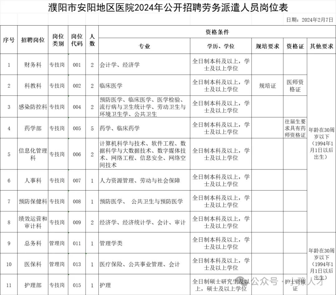 根据医院发展需要,我院拟向社会公开招聘劳务派遣工作人员。现将有关事宜公告如下: 一、需求岗位和数量 本次招聘医技管理岗位共20人。劳务派遣工按照安阳市最低工资标准发放工资,另外每月发放500元绩效工资,满2年后医院按20%比例择优录取为人事代理职工。 岗位信息详见附件1《濮阳市安阳地区医院2024年公开招聘劳务派遣工作人员岗位表》。 (图片可放大查看)