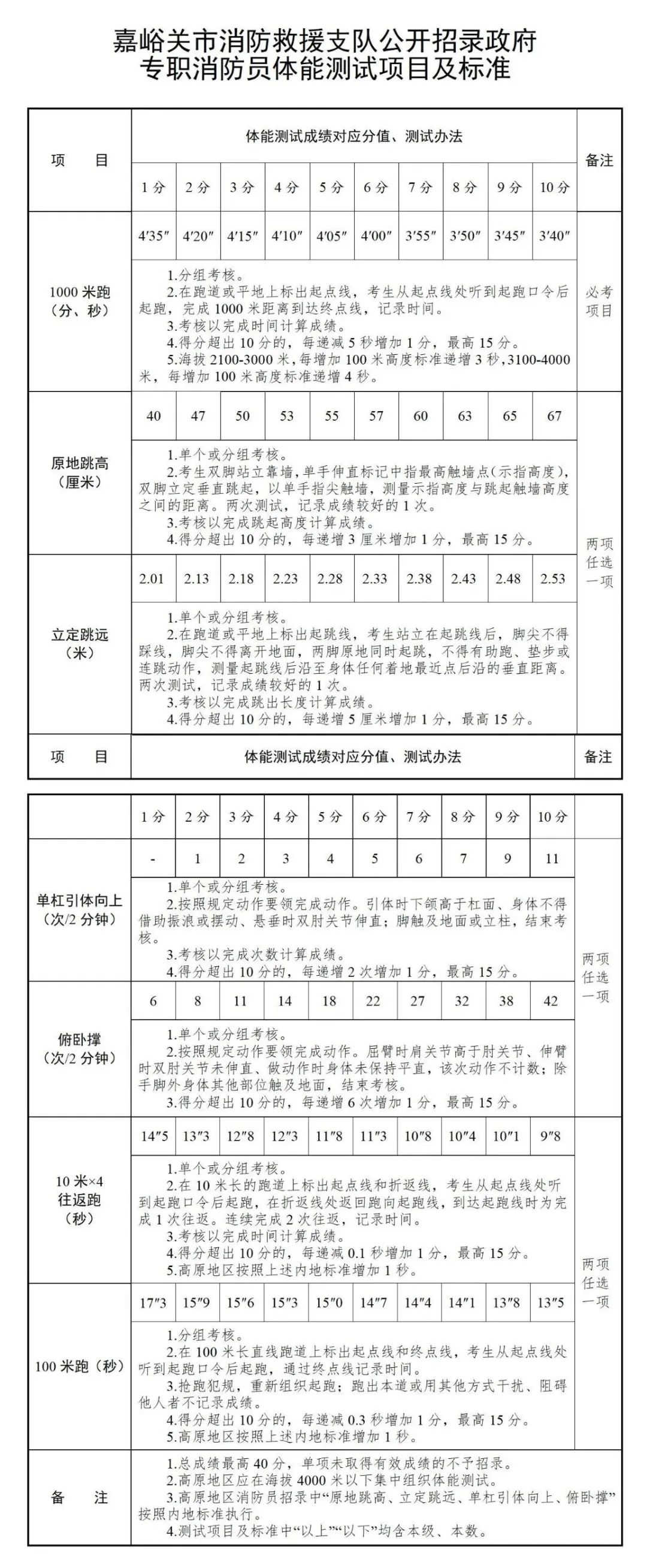 2024年嘉峪关市消防救援支队 公开招聘政府专职消防员 公告 为进一步加强市消防救援队伍建设,充实消防救援力量,提高防灾减灾救灾能力,市消防救援支队面向社会公开招聘政府专职消防员,现将有关事项公告如下: 一、招聘计划 政府专职消防员30名。 二、招聘条件和范围 (一)招聘条件 2.身体健康,五官端正,无残疾,无口吃,无重听,无色盲,无纹身,无传染性疾病,无精神遗传性疾病等,男性身高165厘米以上(含165厘米),双眼裸眼视力不低于4.6、矫正视力不低于5.0。 3.年龄18至26周岁(1998年3月1日至2006年3月1日期间出生),大学本科及以上学历人员年龄可放宽至28周岁(1996年3月1日及以后出生)。 4.男性。 5.户籍不限。 6.高中(中专)及以上文化程度。 7.计算机类、广播影视类、艺术设计类、体育类、公文写作类、宣传类等专业或具有以上专业技能及特长人员(持相应职业资格证书或专业技术资格证书)在同等条件下优先聘用。 8.退役军人和有从事消防救援工作经历的优先聘用。 9.持有B2以上驾驶证、汽修证、无人机操作证、舟艇驾驶证、厨师等级证等消防救援工作急需的特殊专业人才在同等条件下优先聘用,年龄可适当放宽至30周岁(1994年3月1日以后出生)。 (二)有下列情形之一者不得报考 1.近三年来,参加机关事业单位工作人员招聘中有作弊、弄虚作假等行为的。 2.有违法犯罪记录或受过刑事处罚、劳动教养、少年管教的。 3.涉嫌违法违纪正在接受审查,尚未作出结论的。 4.受过党纪、政纪、校(院)纪、军纪处分的。 5.本人有较为严重的个人不良信用记录,或在从事其他工作期间因违法违纪被国家机关、事业单位或其他聘用单位开除、辞退、解聘的。 6.道德败坏,有不良行为,受过公安机关处理的。 7.本人或家庭成员、主要社会关系人参加非法组织、邪教组织或从事其他危害国家安全活动的。 8.法律法规规定的其他不宜从事招聘岗位工作的。 三、招聘程序 本次招聘工作坚持公开、平等、竞争、择优的原则,按照“发布公告、报名初审、测试考核、体检、政治审查、确定人选”等程序进行。 (一)报名及资格审查 1.报名时间:2024年3月11日至3月15日,逾期不再受理。 2.报名方式: 邮箱:43633150@qq.com (2)实地报名 地址:嘉峪关市镜铁区消防救援大队(五一南路1939号) (3)联系电话: 王 雄 18709495124 刘润韬 18394640528 3.报名所需资料: (1)填写《嘉峪关市政府专职消防员报名登记表》(附件一)。 (2)二代居民身份证、户口本(首页、户主页、本人页)、毕业证、学位证彩色扫描件。 (3)大专以上学历者需提交有效期内的《教育部学历证书电子注册备案表》(登录中国高等教育学生信息网按提示生成,网址:http://www.chsi.com.cn)。 (4)近期1寸免冠彩色电子照片(照片命名规则:身份证号码+姓名)。 (5)退役军人需提供《退出现役证》或《军官转业证》等证明材料。 (6)已与有关单位签订劳动合同的在职人员,需提供单位同意报考的相关材料。 (7)招聘对象提交《承诺书》(附件二)。 (二)测试考核 本次招聘采取体能测试、面试相结合的方式进行。体能测试和面试均为百分制。测试考核总成绩=体能测试成绩×50%+面试成绩×50%。 1.体能测试。测试内容及评分标准请查看附件三。 体能测试时间、地点另行通知。建议所有参加体能测试人员在体能测试前个人购买短期意外伤害保险,最晚于测试前一天生效,并将投保单纸质版于体能测试当天交现场工作人员,同时上交电子版。承保保险公司不做指定,个人根据实际情况自行选择。 2.心理测试。参加体能测试合格的人员参加心理测试,心理测试主要考察招聘对象的心理承受和自我调节能力,心理测试使用第三代武警心理测查系统进行测试,心理测试不合格者,取消应聘资格。 3.面试。面试参照事业单位公开招聘工作人员面试办法进行,实行量化评分,主要考察身体形态、仪容仪表、语言表达、交流沟通等内容。面试小组应对每位应试人员进行客观、公平、公正的评价,集体现场打分、当场亮分,当场汇总成绩。 (三)体检 测试考核通过人员按照招聘计划1:1确定体检人选,体检参照《应征入伍公民体格检查标准》。不在规定时间参加体检的,视为自动放弃。对于在体检过程中,弄虚作假或者隐瞒真实情况致使体检结果失真的体检者,取消聘任资格。体检不合格的视为淘汰,按测试考核总成绩排序依次递补。体检时间、地点另行通知。体检费用由个人承担。 (四)政治审查 对测试考核和体检合格人员进行政治审查,主要包括本人现实表现、家庭成员及主要社会关系的政治情况等。(附件四)。 (五)确定人选 招录办公室根据报名初审、测试考核、体检和政审等情况,综合研究提出拟聘用人选后面向社会进行公示,公示时间为5个工作日。公示期满后,无异议的或者经研究不影响聘用的,办理相关手续。 (六)人员补聘 聘用人员在培训期间自动放弃或经培训考核不合格,或有符合应当依法解除劳动关系情况的,市消防救援支队与聘用人员解除劳动关系,空缺指标由招录办公室按未聘人员综合成绩从高到低进行补聘。 四、薪酬待遇 (一)政府专职消防员每月工资约6400元以上(含社会保险)。 (二)政府专职消防员在职期间可以参加各类职业技能培训、鉴定,符合相应条件的优先推荐参加国家行政编制消防员招录。 (三)按照《消防员职业健康标准》开展职业健康监护,为政府