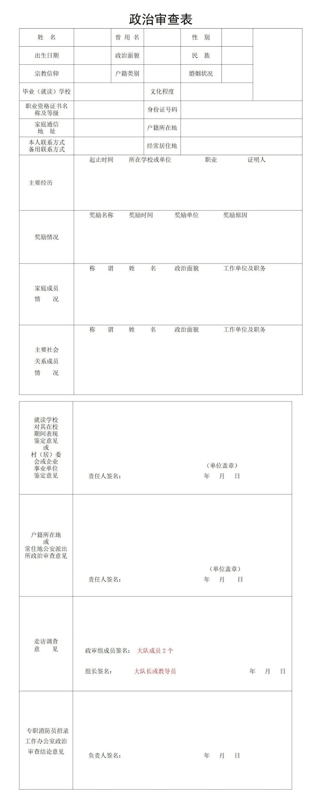 嘉峪关市消防救援支队政府专职消防员政治审查表 附件4:政治审查表.doc(填表时将红色部分删除、正反面打印)