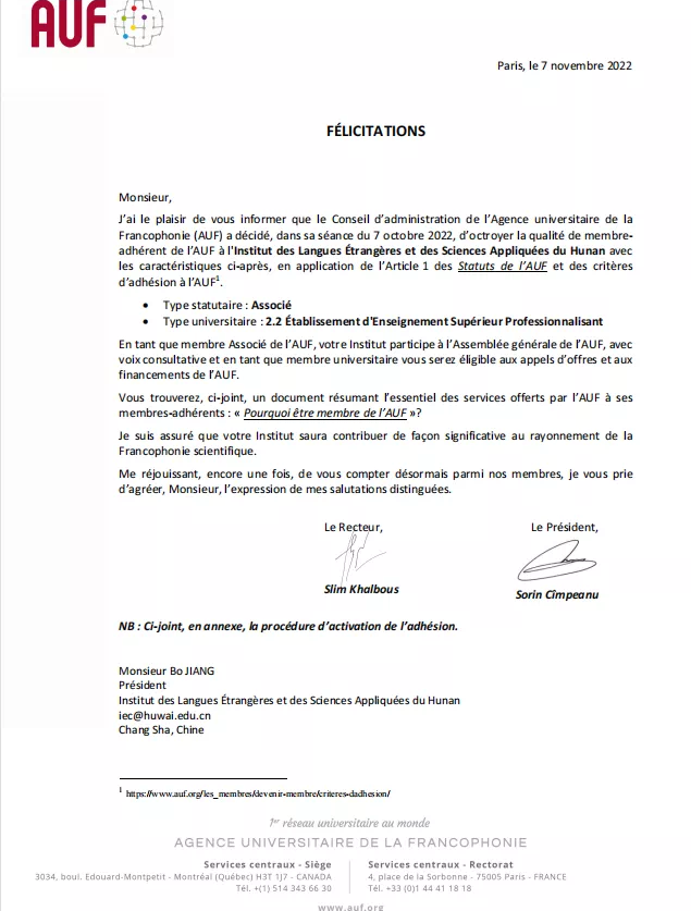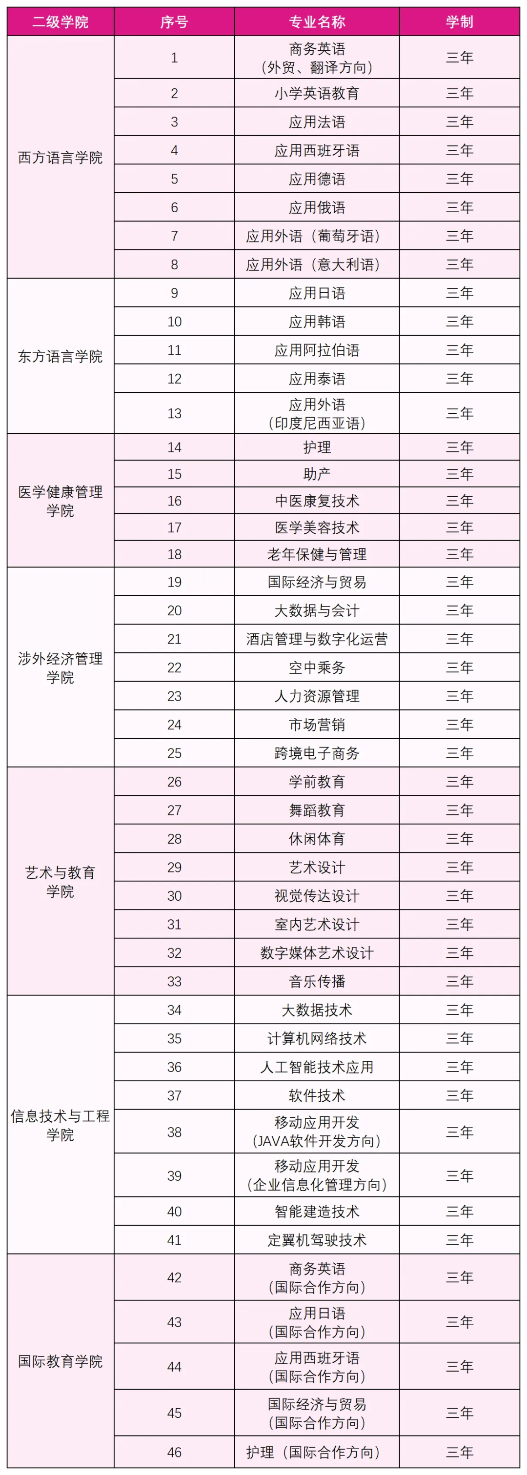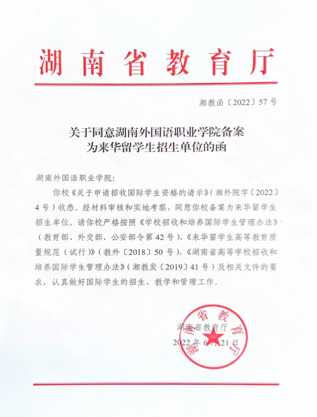 让我们从这里走向世界! LET’S GO TO THE WORLD FROM HERE! 招生代码:4788 国标代码:14072 办学品牌 全国具有国际影响力的“50强”高职院校 全国综合办学实力“10强”民办高职院校 中南地区小语种专业最为齐全的高职院校 “一带一路”高端技术技能人才输送中心 湖南省就业创业“一把手工程”优秀单位 湖南“三高四新”战略涉外人才培养摇篮 湖南省文明高校 长沙市文明校园 学校简介 ![]() ![]() ![]() 湖南外国语职业学院具有30年办学历史,是一所“市场化、职业化、国际化”办学特色鲜明的高职院校。学校始终坚持以“办有情怀的教育,育有作为的学生,建有品质的学校”作为目标追求,致力建设一流的条件、一流的环境、一流的专业、一流的师资,通过立德树人为学生成长、成才、成功提供最优质的教育资源和最系统的发展服务,现位居全国最具国际影响力的高职院校50强,为世界职业教育院校联盟会员高校、长沙市文明校园、湖南省文明高校,为我省小语种应用性人才培养基地、涉外商贸服务人才培养摇篮、国际教育合作交流示范中心。 ![]() ![]() ![]() ![]() ![]() ![]() 育人环境 学校位于长沙市望城区,占地面积71万平方米,建筑面积55万平方米,教学科研用房28万平方米,教学科研设备总值9800万余元,拥有纸质和电子图书共有140余万册。学校拥有气势恢弘的教学群楼、设施一流的学生公寓、服务集成的美食广场、规范标准的运动场馆、共享开放的实训平台、高端大气的藏书系统、舒适优雅的育人环境,构成了一个现代化、数字化、生态化的校园。 ![]() ![]() 教学 群楼 ![]() ![]() ![]() ![]() ![]() ![]() 美食 广场 ![]() ![]() ![]() ![]() ![]() ![]() 学生 公寓 ![]() ![]() ![]() ![]() 教育教学 根据各专业特征,学校建设了一批集实践教学、社会培训、企业真实生产、运营和社会技术服务于一体的高水平校内校外专业化产教融合实训基地。在校内建立了应用外语类、信息技术类、经贸服务类、教育及艺术类、医学康养类等近百个“情景模拟实训室(中心)”。同时,每个专业建立有3-5个企业实践教学基地。通过校企共商培养方案、共建指导队伍、共管教学过程,充分发挥校企“双主体”培养作用,使学生专业技能培养真正做到平台扎实、落实到位。 其中学校医学健康管理学院秉承实施湘雅式的教学模式,连续八年全国护士执业资格考试通过率96%以上,领先同类院校平均水平。学校建有医学护理实训楼、基础医学、基础护理、临床护理、康复实训、医美实训、老年护理等校内实训室共76间。目前已经建立中南大学湘雅医院、湘雅二医院、湘雅三医院、湖南省人民医院、湖南省妇幼保健医院、湖南省儿童医院、长沙市中心医院等40余所全国三甲医院为校外实习、实训、教学基地,在省内同类院校中均居于前列。 2024 ![]() ![]() ![]() ![]() ![]() ![]() ![]() ![]() ![]() ![]() ![]() ![]() ![]() 2023年9月,湖南省教育厅公布了2023年度“楚怡杯”湖南省职业院校技能竞赛获奖名单。湖南外国语职业学院在2023年度“楚怡杯”系列竞赛中再创佳绩,共斩获15项奖项;同时学校还因突出的统筹协调能力,获得本届大赛“优秀组织奖”。 ![]() ![]() ![]() ![]() ![]() ![]() ![]() 国际交流 湖南外国语职业学院是湖南省对外交流与合作最活跃、国际化办学特色最鲜明的高职院校,与美国凯泽大学、英国桑德兰大学、西班牙萨拉戈萨大学、日本北洋大学等20余个国家的40多所大学缔结了合作关系。学校是世界法语大学联盟、中非经贸合作职业教育产教联盟和湖南省人才交流协会成员并由省教育厅备案为来华留学生招生单位。2022年11月,学校为积极服务国家“一带一路”倡议,成立了菲律宾文化研究与交流中心。 招生专业 (一)国家任务单招、统招专业一览表 备注:国际教育学院所有专业必须通过单独英语测试,并达到合格分数才予以录取,否则按普通专业录取。 (二)退役军人招生专业和招生计划 招生专业所有专业均可填报,招生计划100人。 请符合条件的在2024年3月10日需携带本人身份证、湖南省2024年高职单招报名身份界定表及相应资格证明材料(退出现役证或转业证)到招生就业处办理资格确认手续。 就业特色 学校坚持以专业建设为龙头,深入推动教育教学改革、校企协同育人、国际交流合作、就业市场开拓、校园文化凝练,人才培养质量过硬,学生就业前景广阔。学校成立产教融合学院,重点实施了“十百千”工程,即建设10个产教深度融合的示范性项目,100个优质的实习实训基地,1000家稳定的学生就业基地。近三年来,学校毕业生就业率达到90.0%,就业专业对口率达50%以上,其中外语类专业境外就业率达到5%以上,学校多次被评为湖南省就业工作先进单位,2022年10月我校创业孵化基地被评选为第二轮第三批湖南省高校大学生创新创业孵化示范基地。学校的社会影响力和知名度也不断提升,现为中国教育国际交流协会常务理事单位。 ![]() ![]() ![]() ![]() 2023年4月21日,我校与浪潮卓数(北京)大数据技术有限公司举行校企合作签约仪式 ![]() ![]() 我校举办外语专业校企合作订单班集中签约仪式 ![]() ![]() ![]() 宁翔副董事长一行考察中洋集团安哥拉奥德工业园 ![]() ![]() 宁翔副董事长一行考察中铁二十局集团安哥拉国际有限公司 ![]() 左右滑动查看更多 ![]() ![]() 湖南外国语职业学院非洲校友总会成立大会 就业明星 ![]() 胡权 商
