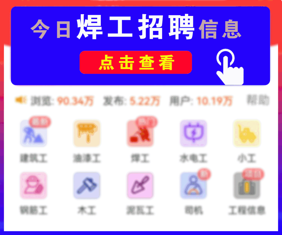黑龙江牡丹江招聘钢结构安装焊工,日薪350元,包吃包住,月结工资,中间可以借支;联系人:17131971777吉林延边朝鲜自治区招收电焊工师傅,薪资待遇面议;联系人:15662187837我是电焊工,焊管道,大管盖面十来年经验,二级片手,单大绿本证,希望工资可靠的老板联系我,手机 : 19135444343黑龙江省齐齐哈尔市铁路单位招收电焊工1名,要求男性18-55岁,身体健康,日薪155,每天工作4-5小时,工期不长,附近的师傅有等活的来;联系人:18543061646山东省菏泽市招收管道工师傅,日薪500元,氩电焊工二级片日薪550元,不拍片日薪450元,普焊日薪400元(要求有单证),小工日薪240,每天工作9小时,加班费1:1,工资押一付一,包吃包住,工期到位报销来回路费;联系人:18902037383招聘二保焊,不要证,主要平焊立焊,包吃住,52岁以内,320-380/天,联系电话:17616321791浙江嘉兴招收二保电焊工师傅,要求有技术就行,包吃包住,薪资待遇面议;联系人:18962108700新疆省吐鲁番地区鄯善县招收焊工、管工师傅1名,工作地点在鄯善合盛,薪资待遇面议;联系人:15981869610招聘氩弧焊工,工作地点新疆昌吉!日薪600元!联系人:杨先生 13565369772本人是一名焊工家里祖祖辈辈都是焊工各位老板有需要的可以联系我活可以给各位老板保证板生,临时和长期咱都可以,姓名 : 罗国浩,手机 : 15373317881九龙坡徐工8000-10000二保焊 [炸弹]岗位要求:1.做过焊桥, 船厂,会多层多道焊都可以,或者有2年及以上钢结构二氧化碳气体保护焊工作经验,清过焊渣 2.有中夜班,一个班次8-11小时(可先上岗再考证) 3.要求年龄43岁及以下,限男性,初中及以上学历。薪资待遇:个人计件8000-10000(元),六险、交通补贴、餐补、高温补贴、过节费 重庆市九龙坡区九龙工业园,电话18580269089天津天津城河东招收电焊工孙师傅1名,薪资待遇面议;联系人13708961948山东省招收模具钳工多名,有五险一金+包住,年龄21-35岁,男有2年工作以上,学历不限。工作内容:负责注塑模具(汽车、家电、精密)的组装、装配,薪资待遇面议;联系人:15763943826河南省郑州市金水区招收焊工师傅1名,薪资待遇面议,干活在郑州;联系人:18865950618吉林省四平市铁东区招收电焊工师傅,主要负责不锈钢护栏焊接,总共15米,日结,有工具;联系人:15822889729兴宁市新建人民医院现招聘:亚弧焊师傅,悍不锈钢傅傅多名,小工多名。薪资待遇优厚,中午包吃一餐,每月10号前发工资。有意者电联:13536716508 陈生 (在梅州地区的欢迎来电兰州新区,钢结构安装,需要焊工2名项目地址:甘肃 兰州,电话:15117120826天津武清招聘氩弧焊工,五险一金,单位直招。公司名称:天津君歌化工设备集团有限公司;公司地址:武清区源景道和泉明路交叉口。手机 : 18522314900本单位招聘氩弧焊工5名,工作地点在武清开发区,五险一金。有意向的请电话联系。手机 : 18522314900河北省保定市安新县招收焊工师傅一名,每天工作9小时,下班就结账,日薪300元,二把刀勿扰;联系人:15132227137重庆市江北地区招收一个二保焊工师傅,每天早上8点上班,提前20分钟到场,每天工作9小时,日薪450元,工期3-4天,人走结清;联系人:17802383688招聘电焊工:50名 任职资格:1、能熟练使用氩弧焊、电弧焊、二保焊、埋弧自动焊等;2、有三年以上压力容器焊接经验优先,男女不限;3、有理想,执行力强,能吃苦,有团队合作意识;4、年龄18-50周岁以下;5、工资:日工资均250元左右。项目地址:甘肃 甘南,电话:18232945818我们有4个氩电工人,需要找活,双证齐全,希望找管道的活。孙15523170672