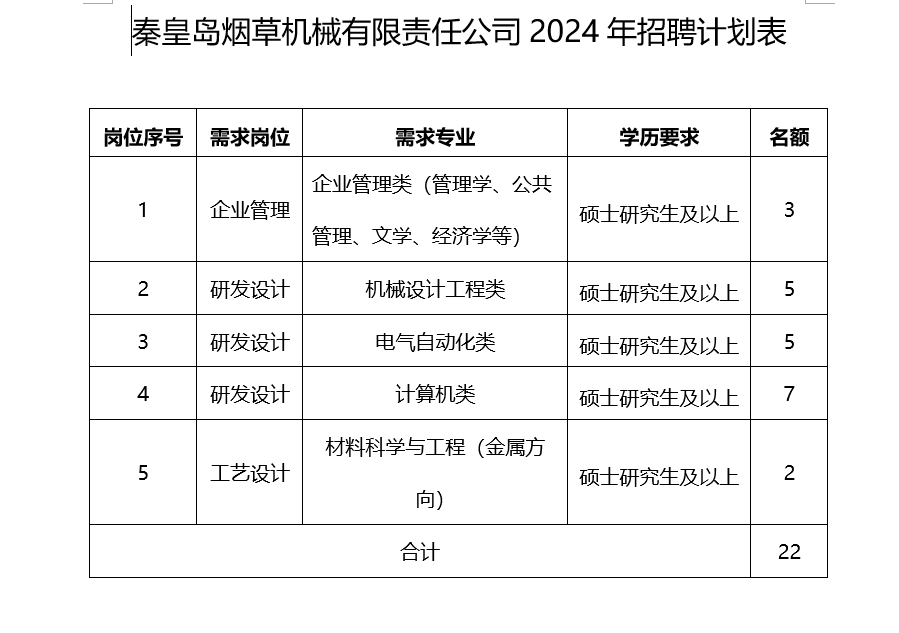具体招聘计划见《秦皇岛烟草机械有限责任公司2024年招聘计划表》(附件1)