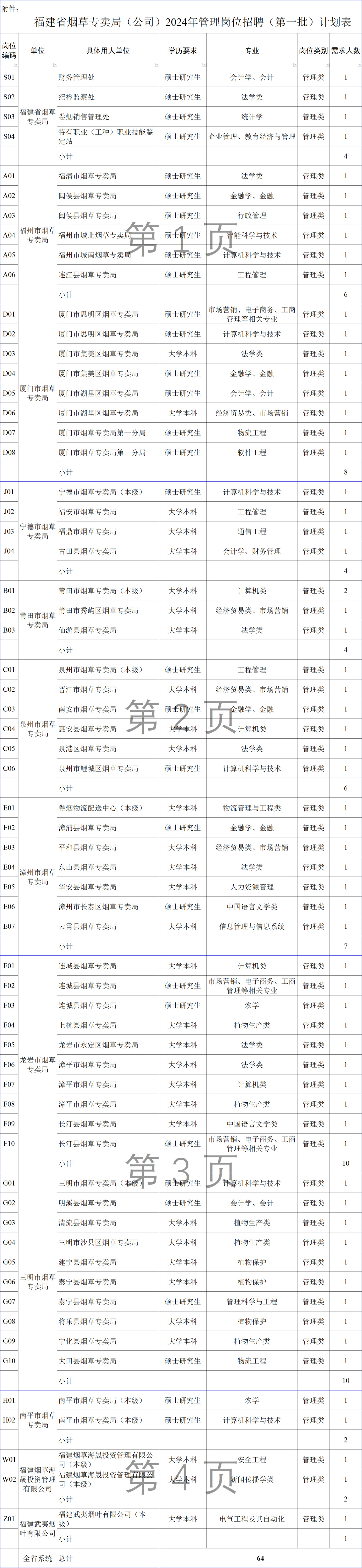 本批次共计招聘64人,具体岗位、专业、需求人数详见附件《福建省烟草专卖局(公司)2024年管理岗位招聘(第一批)计划表》。