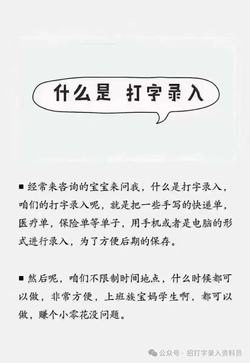 打字录入就是把图片上一些不能复制粘贴的文字 数字 符号给它照数据录入方便后期保存〰和正规企业单位 数据公司签约合作 安全靠谱 手机电脑 iPad都可以操作 全天24小时有任务 多劳多得😘 适合所有宝妈 ,上班族,学生及待业者