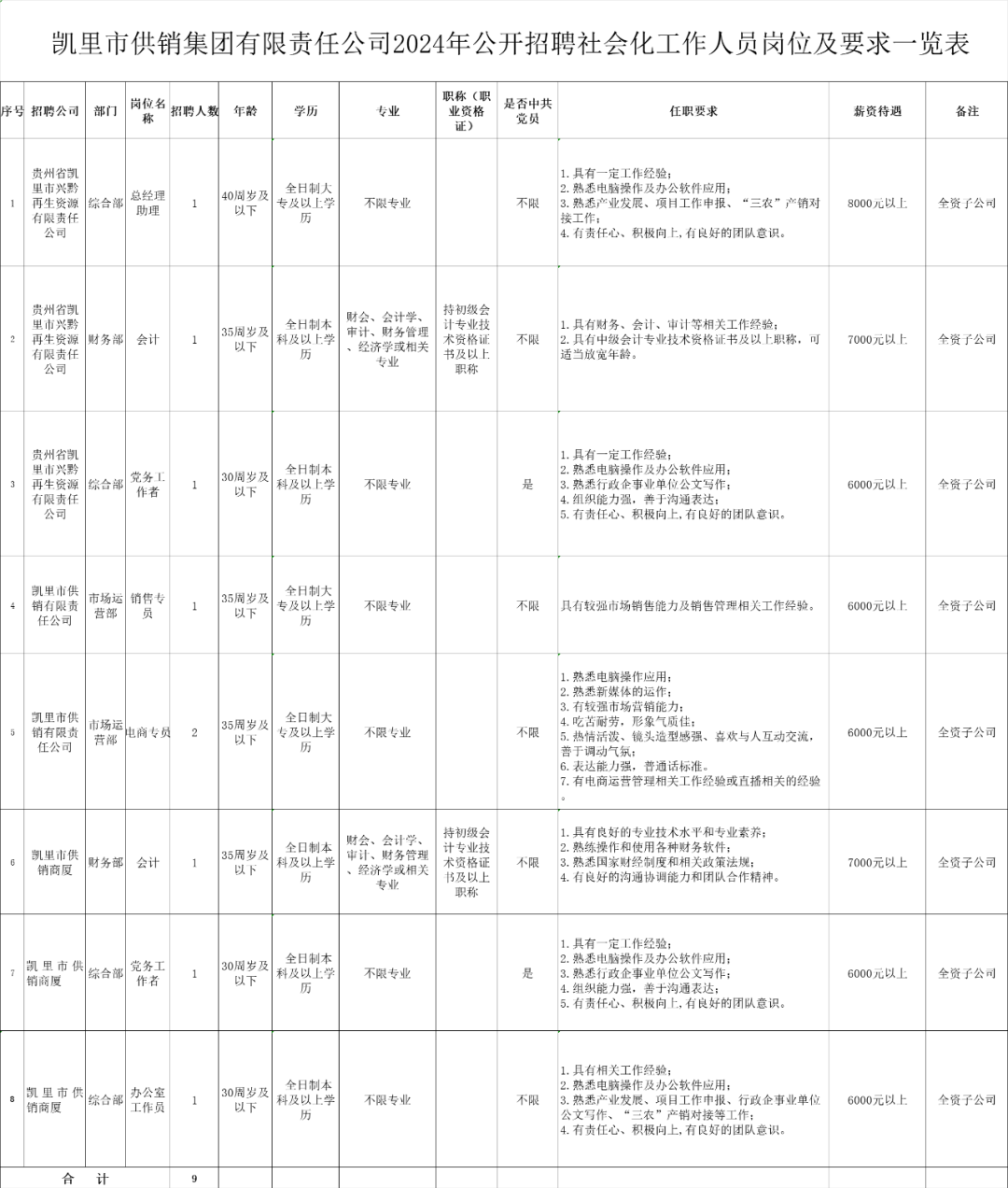 具体招聘岗位及条件详见附件《凯里市供销集团有限责任公司2024年公开招聘社会化工作人员岗位及要求一览表》。