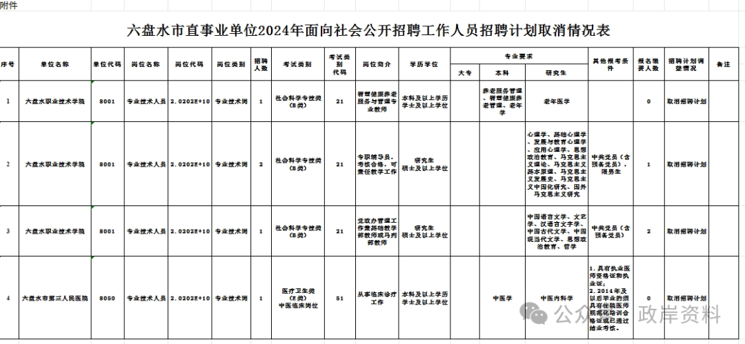 2024年六盘水市直事业单位面向社会公开招聘工作人员招聘计划取消公告