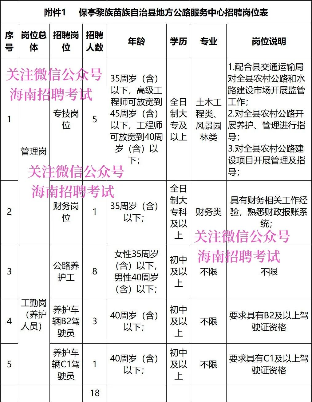 为全面提升我县农村公路管养队伍力量,保障农村公路通行服务水平,保亭黎族苗族自治县地方公路服务中心面向社会公开招聘服务中心工作人员18名,现将有关招聘事项公告如下: