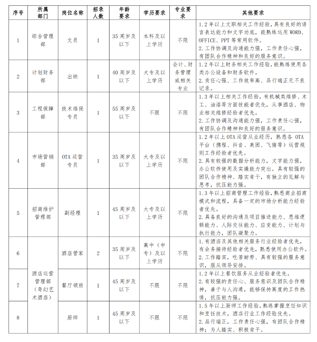 网上报名:应聘人员每人限报一个岗位,将报名材料(以压缩包形式发送,压缩包文件名格式例:“张三应聘综合管理部文员”)发送至电子邮箱邮箱:valleymagic@163.com,请勿投错邮箱。