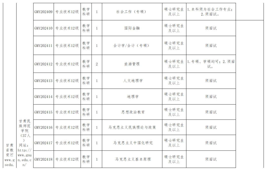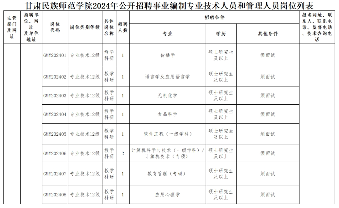 5.具备招聘岗位所需要的学历、学位、专业及其他条件(见附件《甘肃民族师范学院2024年公开招聘事业编制专业技术人员和管理人员岗位列表》)。