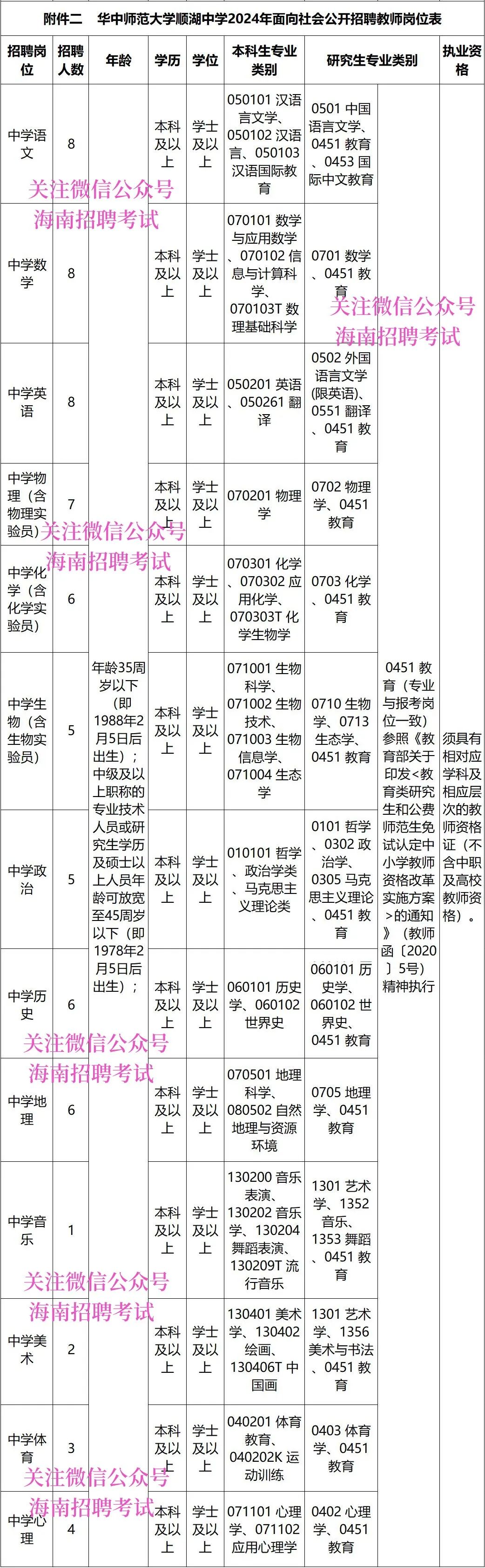 2.具体岗位条件参见《华中师范大学顺湖中学2024年面向社会公开招聘教师岗位表》(附件2)。