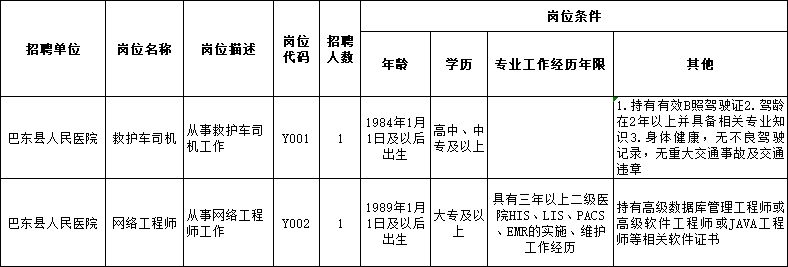 2.学历、专业、年龄、工作经历及其他条件详见《巴东县人民医院2024年公开招考聘用人员岗位计划表》(附件1);