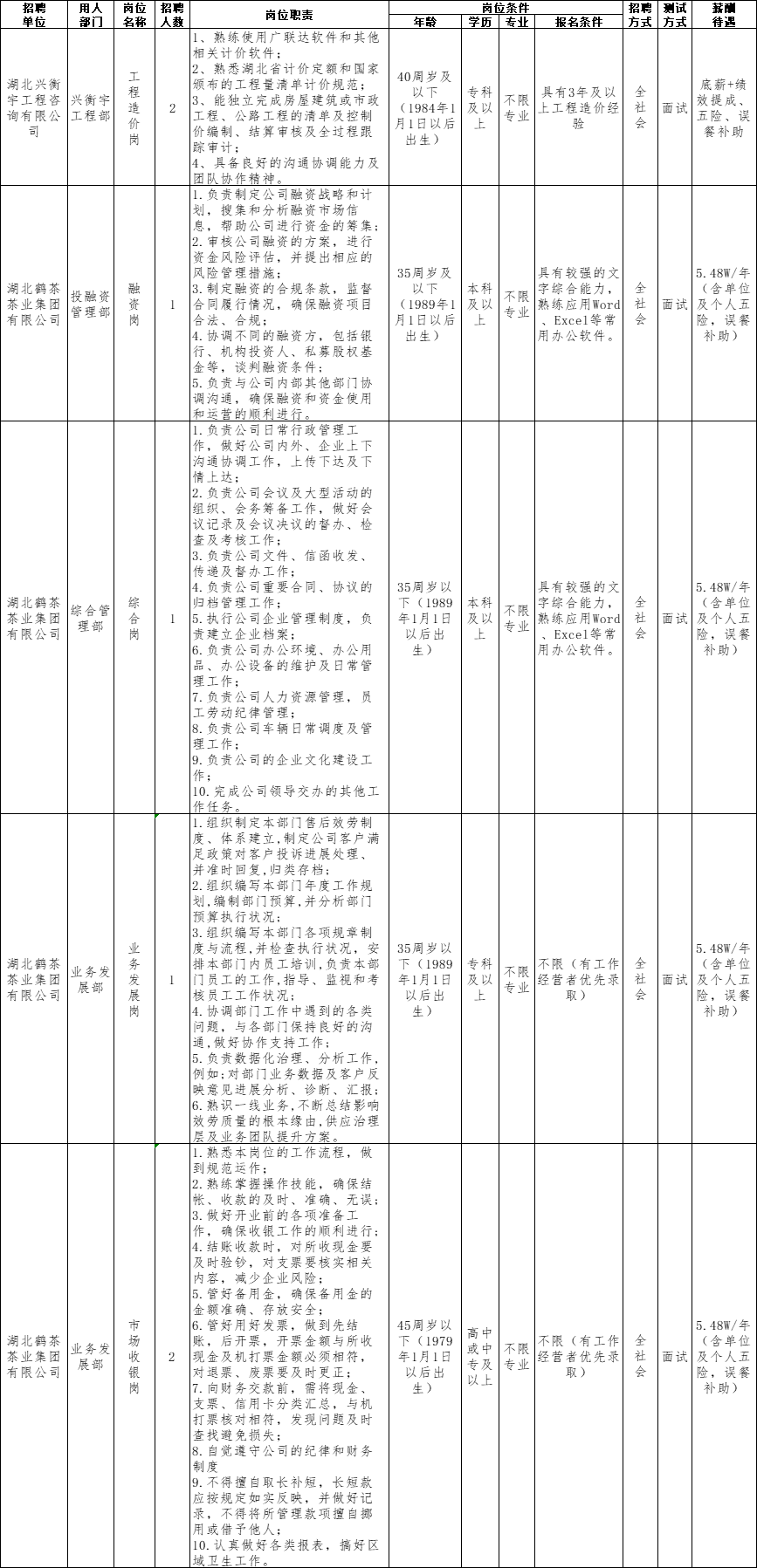 本次招聘湖北兴衡宇咨询工程有限公司工作人员2名,湖北鹤茶茶叶集团有限公司工作人员5人(详见“岗位计划表”)。