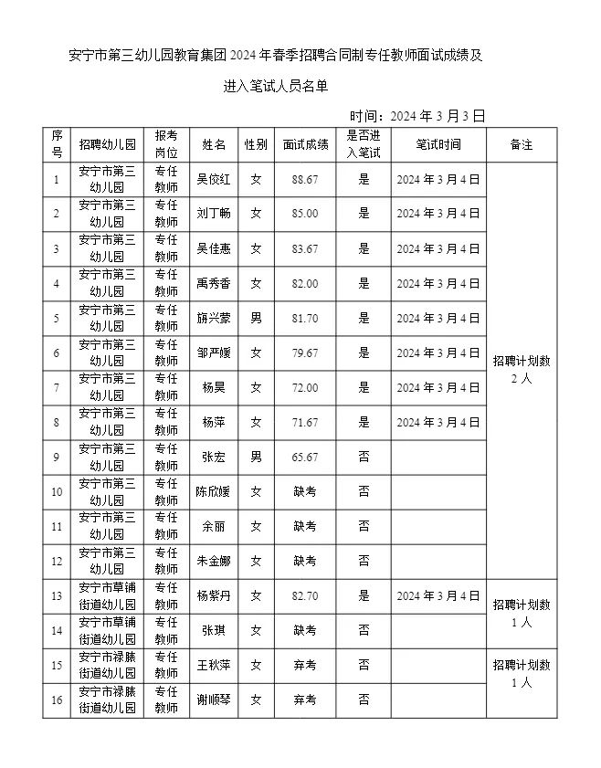 面试成绩及进入笔试人员名单详见附件(《安宁市第三幼儿园教育集团2024年春季招聘合同制专任教师面试成绩及进入笔试人员名单》)