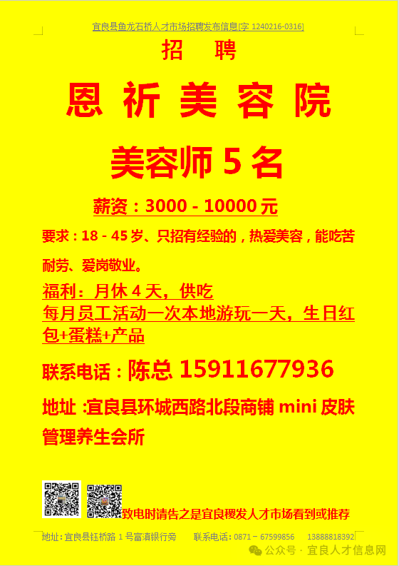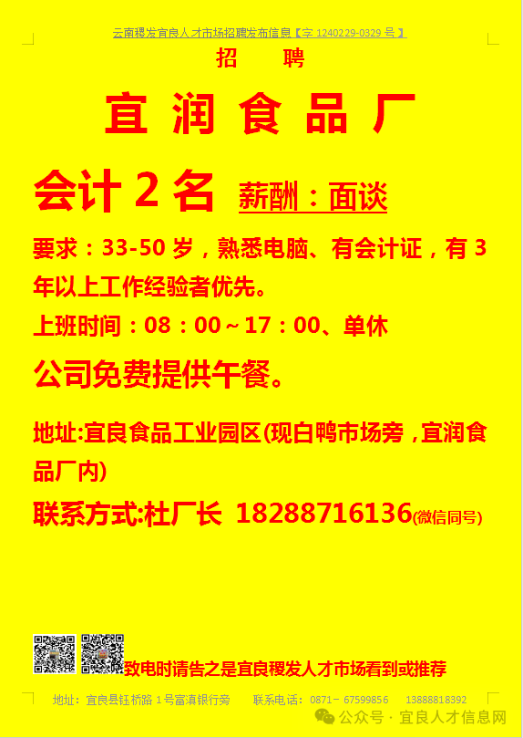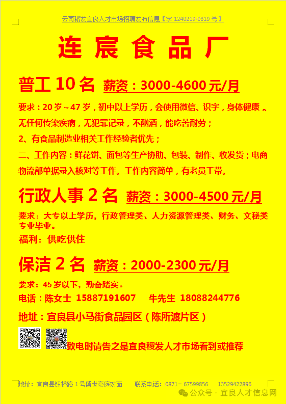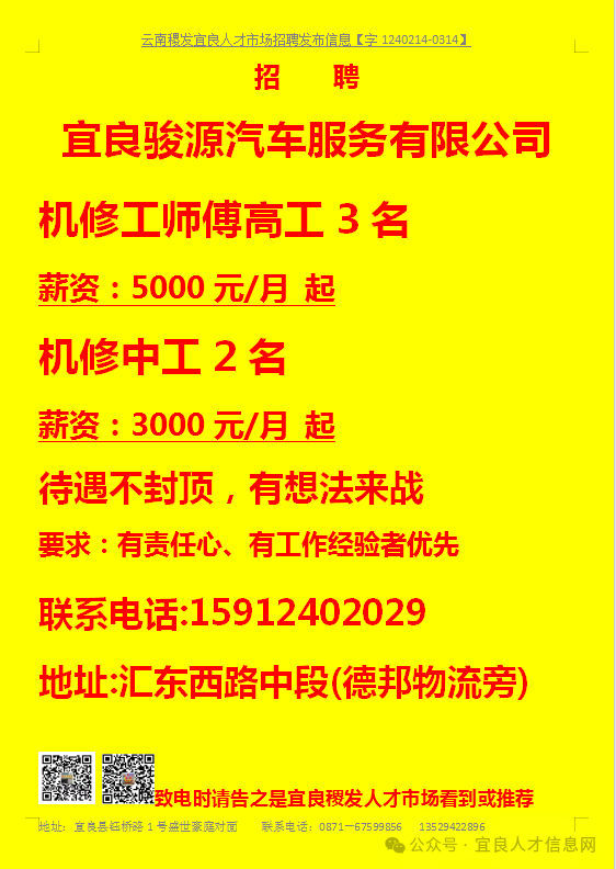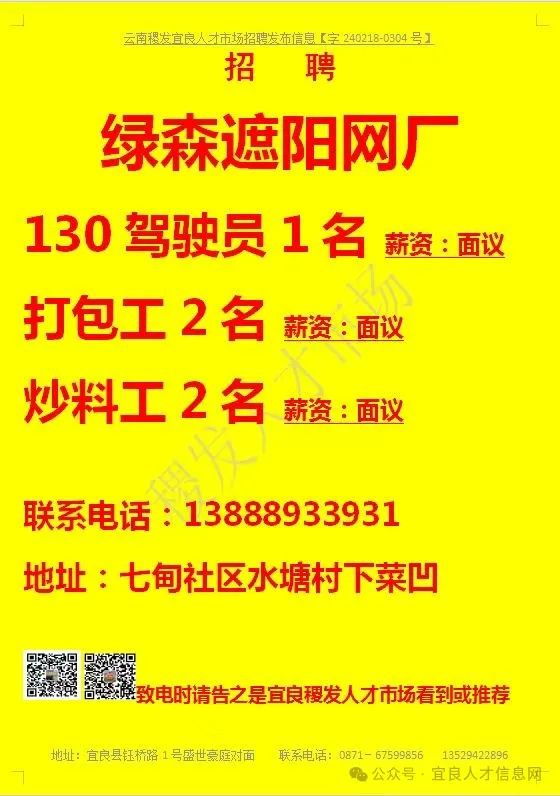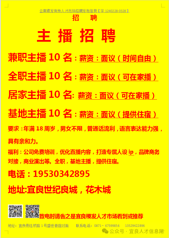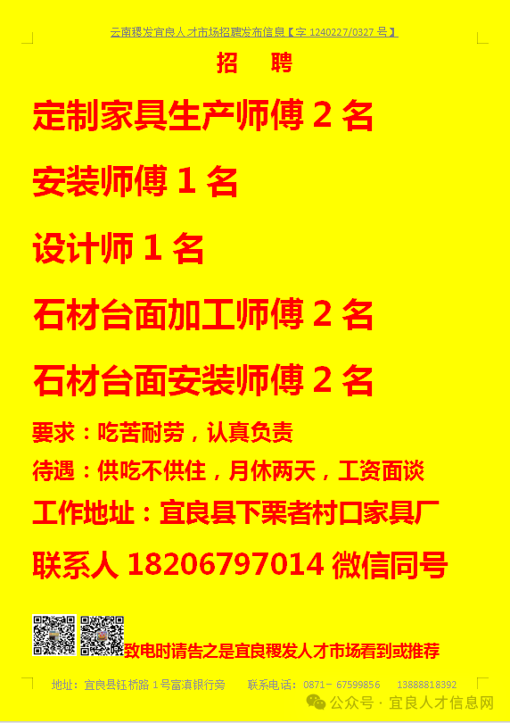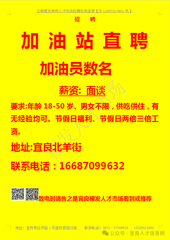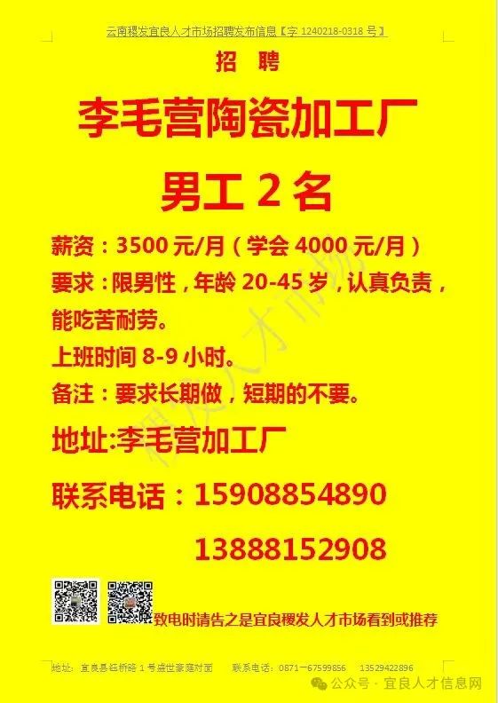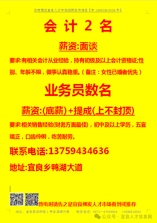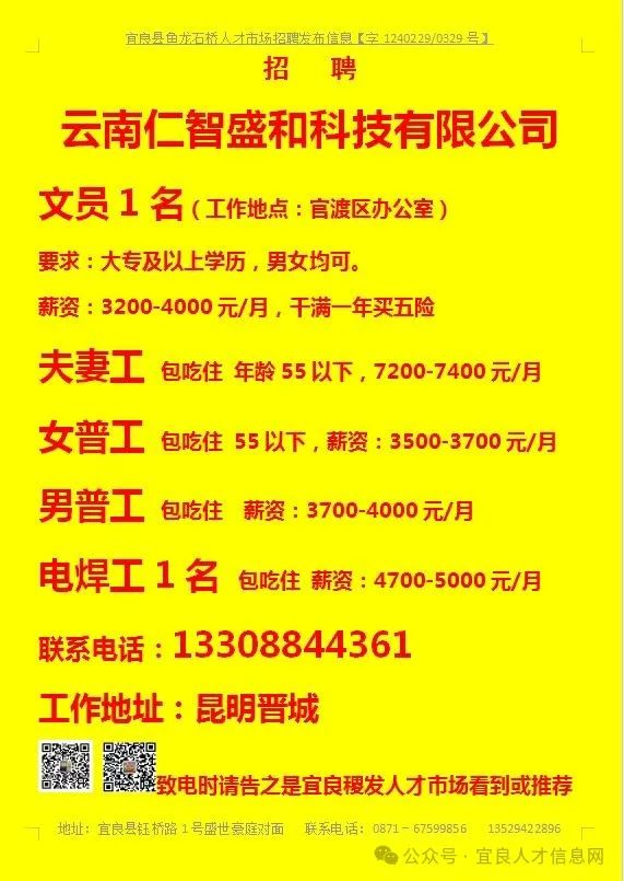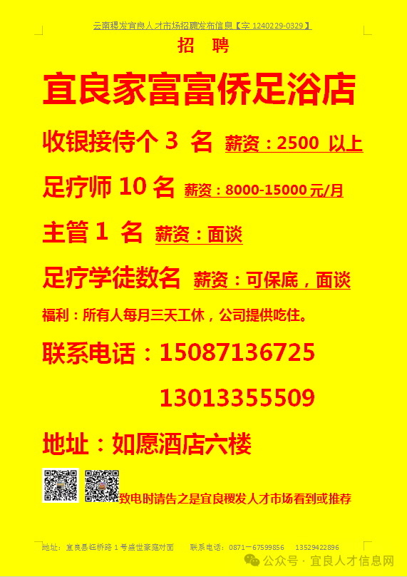 信息发布咨询地址:宜良稷发人才市场一楼大厅