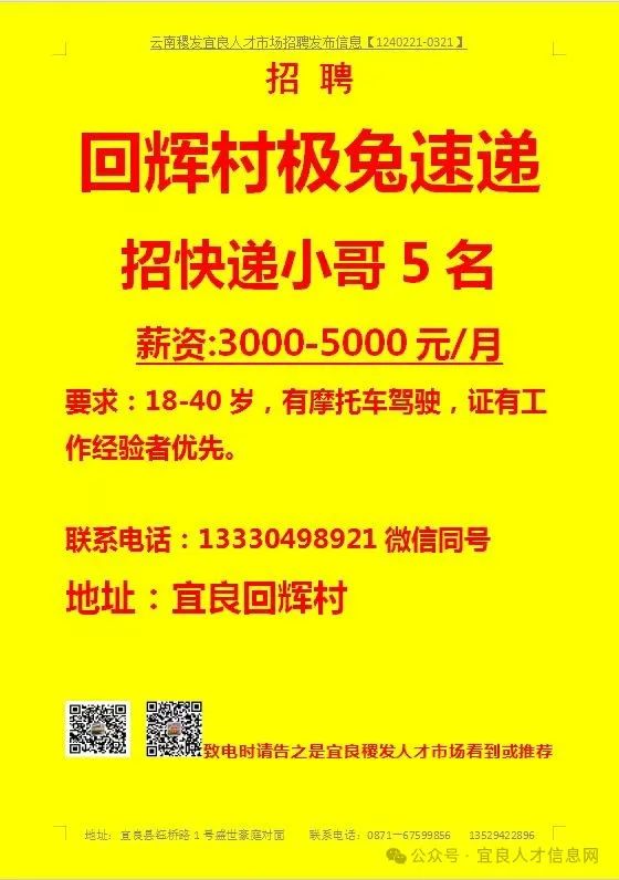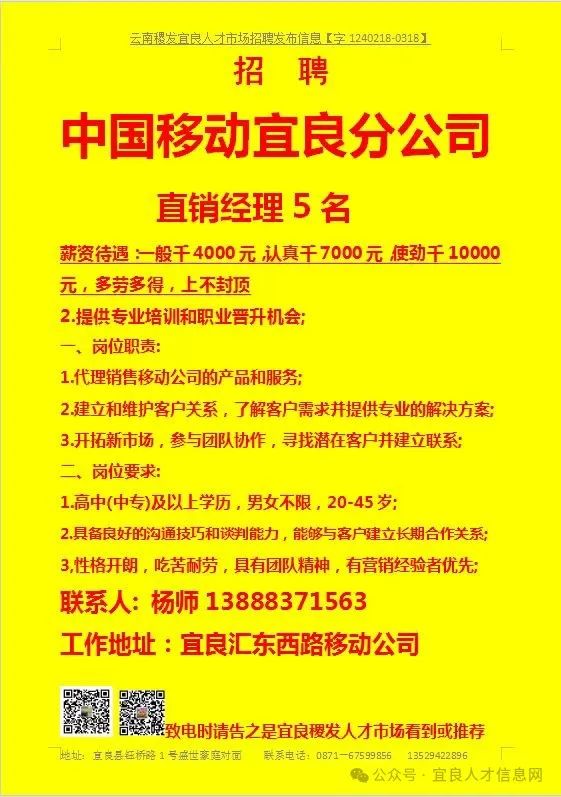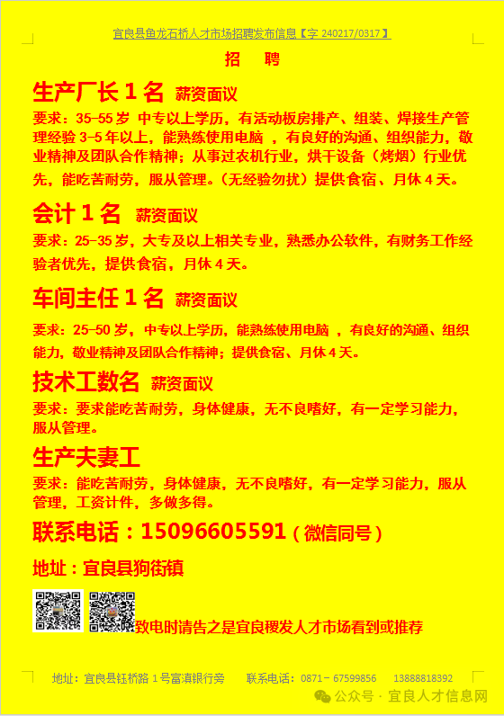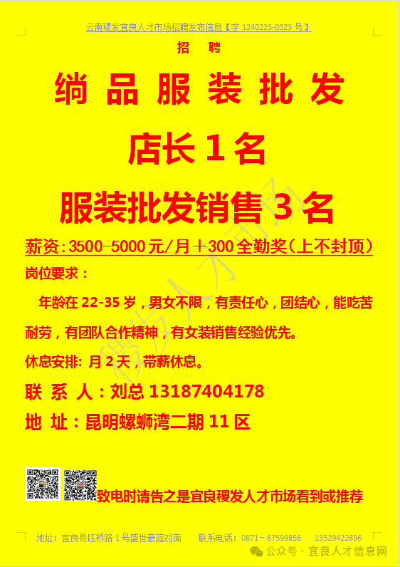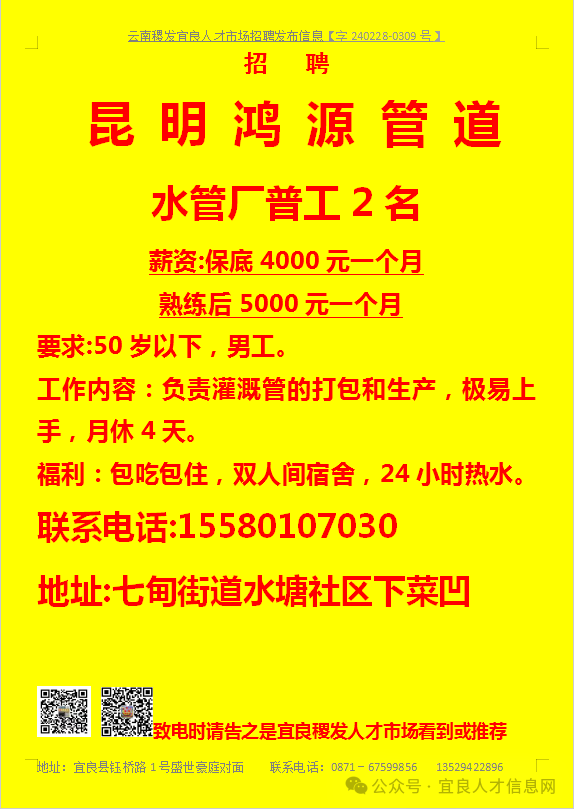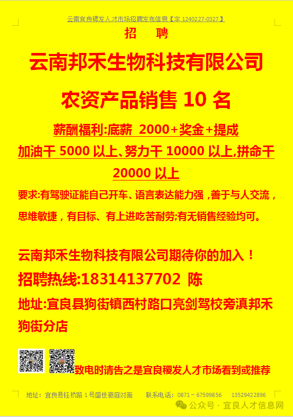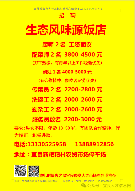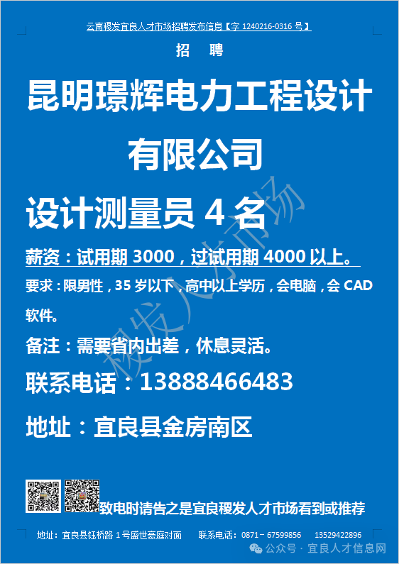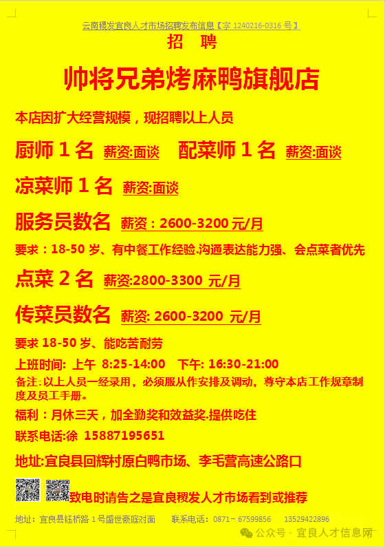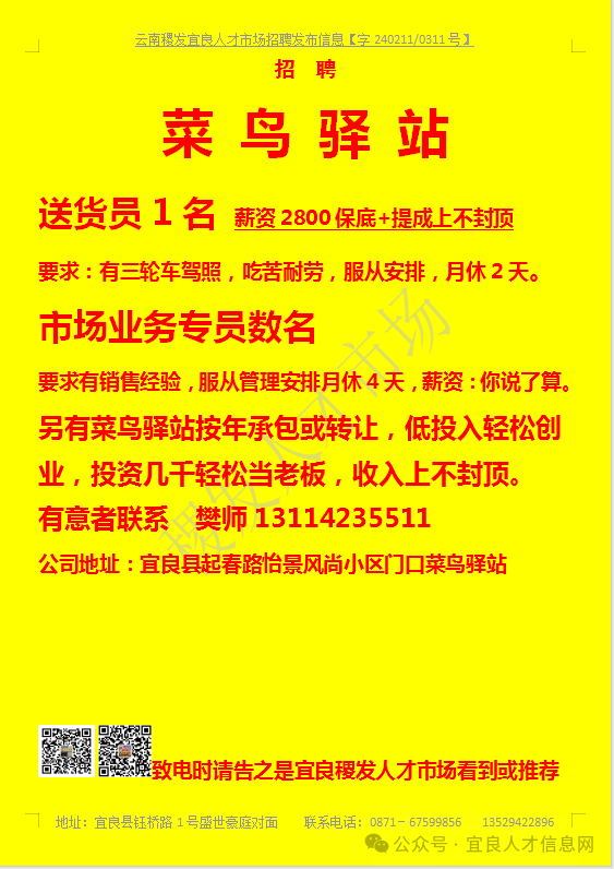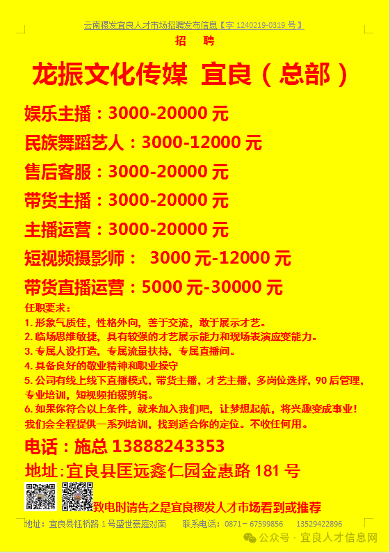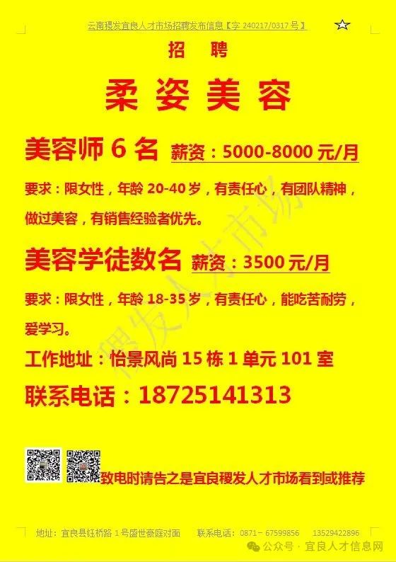 信息发布咨询地址:宜良稷发人才市场一楼大厅