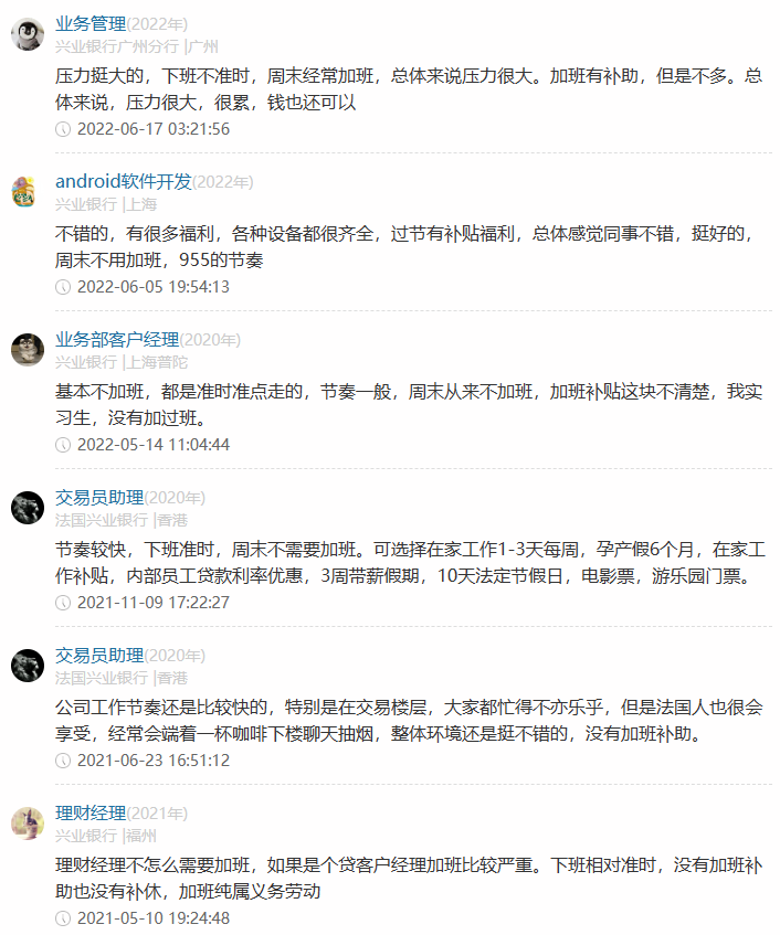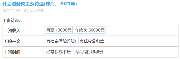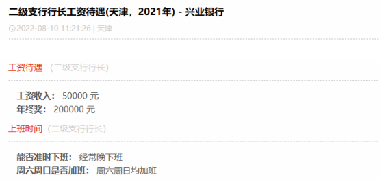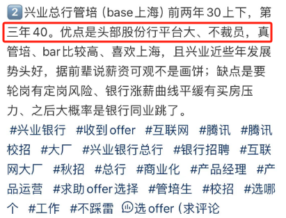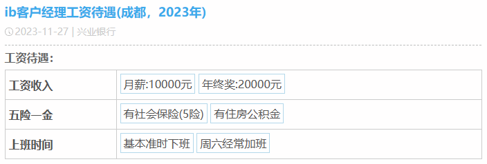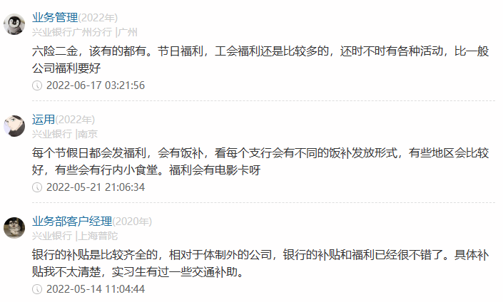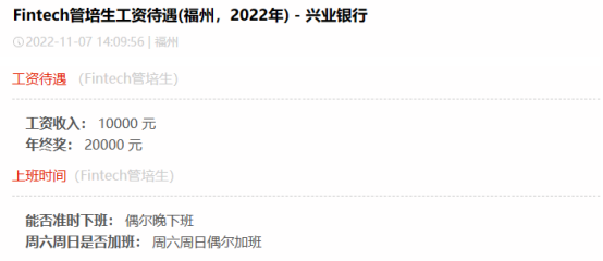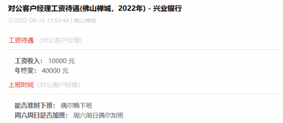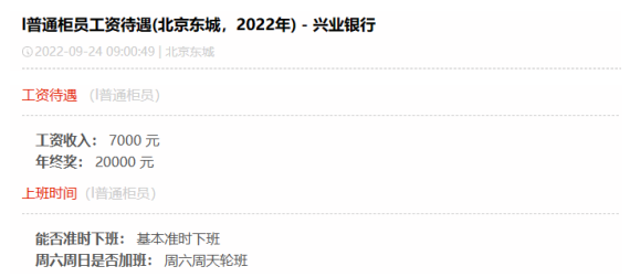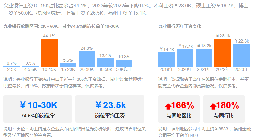 在2023年10月30日,兴业银行发布2023年第三季度报告,其前三季度实现营业收入1612.96亿元,第三季度归属于母公司股东的净利润为222.85亿元,资产质量继续稳扎稳打。截至2022年,兴业银行员工数69840人,人均薪酬高达54.69万元。在网上也有很多人在分享兴业待遇,大家好奇心满满,今天我们就一起揭秘一下。第一位普通柜员月薪为7000元,年终奖20000元。第二位业务管理月薪为15000元,年终奖10000元。第三位Fintech管培月薪为10000元,年终奖20000元。第四位计划财务岗月薪为13000元,年终奖60000元。第五位IB客户经理月薪为10000元,年终奖20000元。第六位对公客户经理月薪为10000元,年终奖40000元。第七位二级支行行长月薪为50000元,年终奖200000元。可以看出,网友分享的兴业银行薪资待遇在行业里还是极具竞争力的!100%年终奖,奖金丰厚。但是大家也知道,岗位不同,地域不同,总行和分行都有较大差异,我们来看下整体情况。而50K以上的占到了10.8%,相当大的高薪比例了。难怪有员工表达:兴业是头部股份行,工资高,平台大,不裁员,真心爽!“有年终奖,是工资大头,和分行业绩挂钩,一般来说好几万吧。”“有,2~5万左右吧,看个人每月业绩,网点利润等各因素。”只言片语间,我们这些无关的看客已被兴业的年终奖淹没......兴业银行的员工福利也非常完善,包括六险二金,补充医疗险,带薪年假,饭补房补,过节购物卡,过节礼金,交通补助,电影卡福利等全部拉满,优秀的员工还能解决北京,上海等地的人才落户名额,员工表示比一般的公司福利都要好。我认为这个还是要看自己的工作性质及效率,辩证的来看待,有些岗位忙,节奏快,加班多,但是收入也会比其他人高,有些闲一点,可能待遇也就不如其他人,兴业银行的整体工作氛围还是不错的,性价比高,这一点有目共睹,毋庸置疑。兴业银行是首批股份制商业银行之一,一家极其优秀的银行,也是A股市场的宠儿,价值投资典范,分红慷慨,拥趸众多。其资产质量常年保持稳定,盈利能力由规模增长转向非利息收入,实现了高质量的发展。兴业骨子里有闽商那种敢拼敢闯勇创新的基因,潜力巨大,未来一定有更广阔的想象空间,我们拭目以待!往期精选: