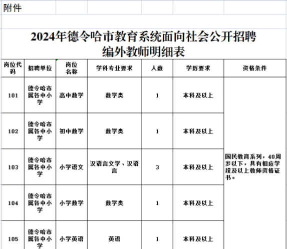 本次面向社会公开招聘编外教师7名,具体岗位和人数详见附件《2024年德令哈市教育系统面向社会公开招聘编外教师明细表》。