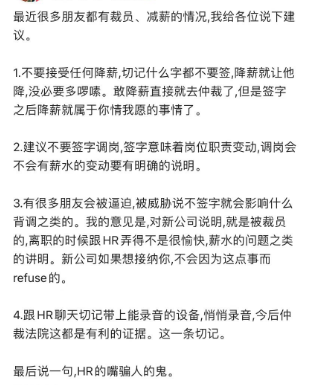 近日,一名网友也给出了自己作为HR的角度,碰到裁员、减薪的情况,应该如何应对的建议: