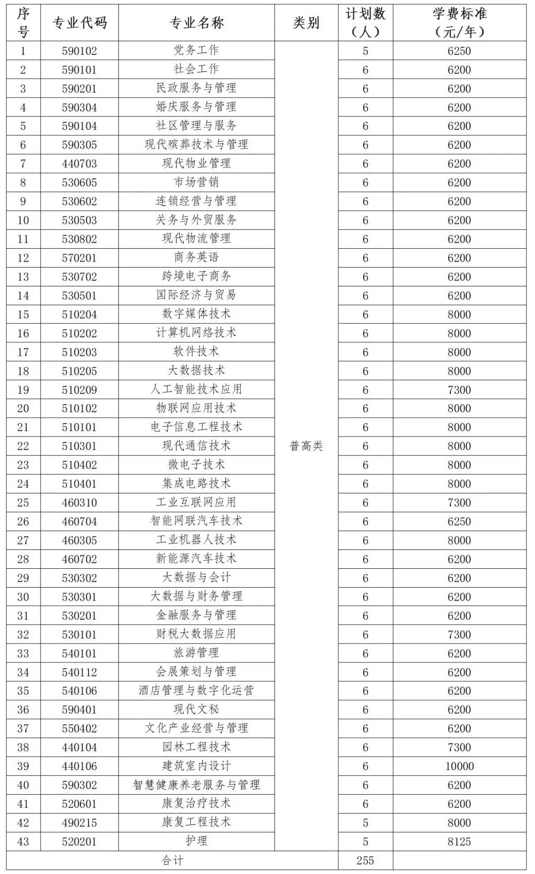 我校2024年在云南省单独招生专业43个,计划招生255人。具体如下:
