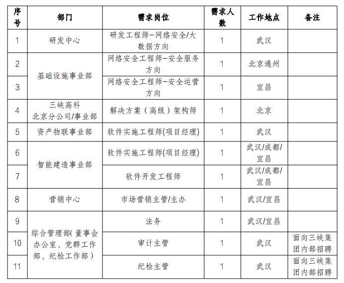 具体岗位主要职责及资格条件详见附件1。其中,审计主管及纪检主管岗位报名范围仅限三峡集团内部员工(签订劳动合同)报名。
