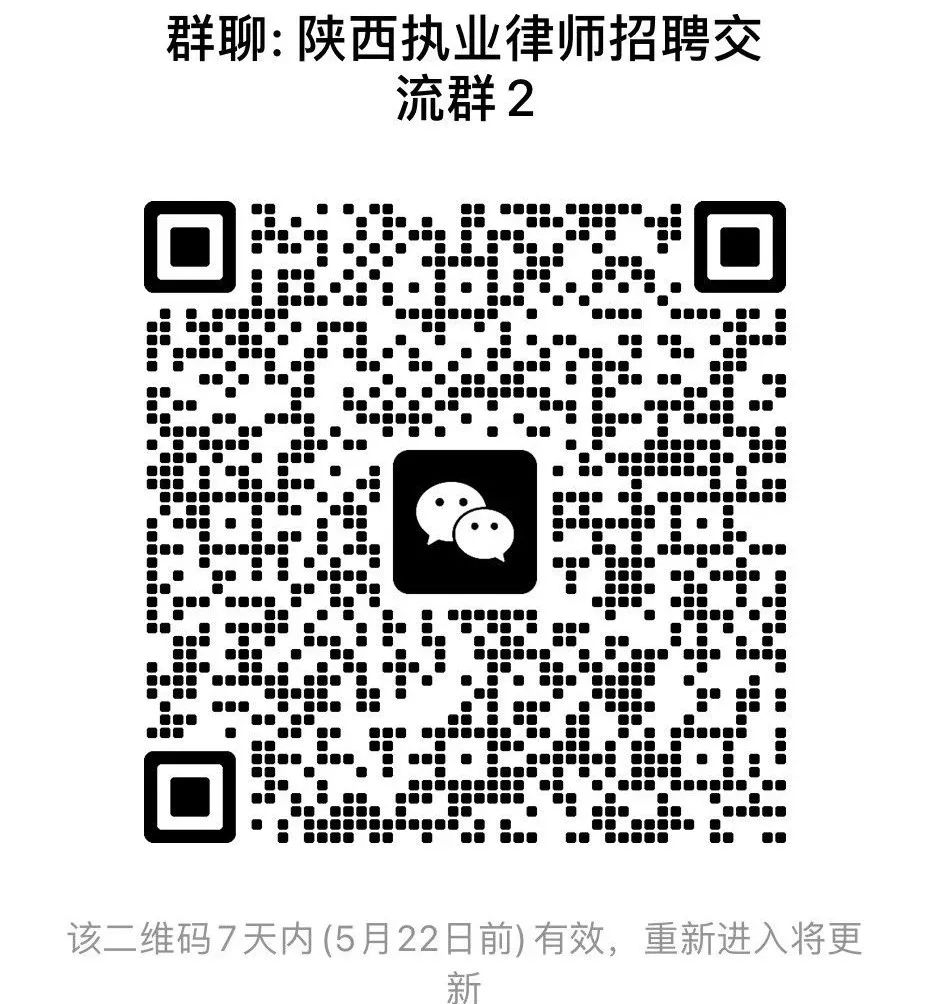 加入陕西执业律师招聘2群,可获取最新陕西律所招聘信息及资源分享交流,群满添加18681819954蔡老师微信,拉你入群。