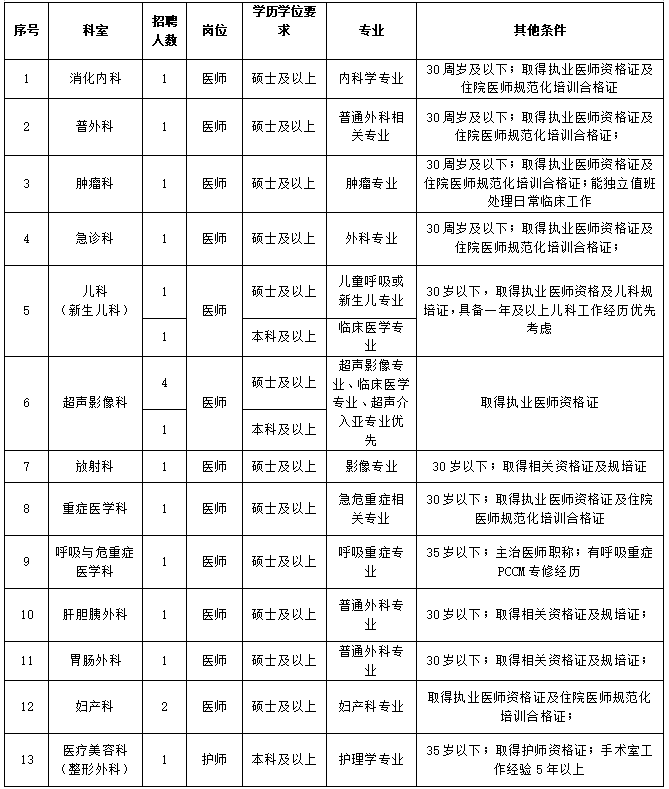 根据医院建设规模和业务发展需要,为加快医院学科建设,满足业务发展需要,培养一支高素质专业团队,现面向社会公开招聘卫生专业技术人才,具体岗位及要求如下: