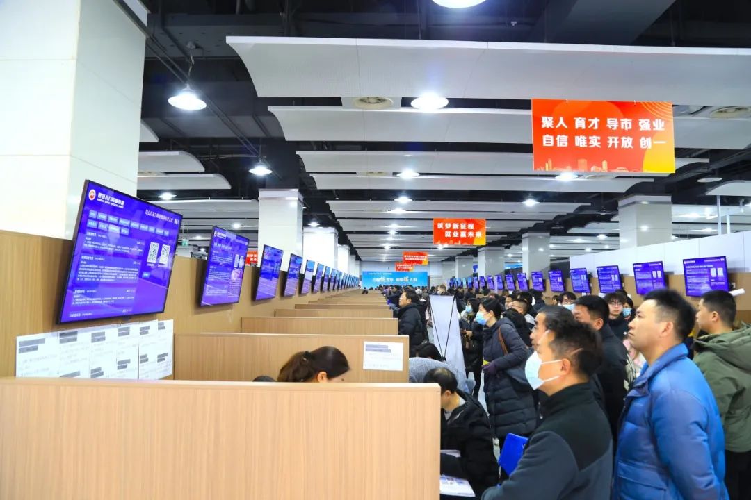招聘会现场气氛热烈,每个招聘展位前人头攒动,涌动着求职的渴望和招才的热情,随处可见求职者与招聘企业火热交谈的场景,部分企业摊位前还排起来长队。