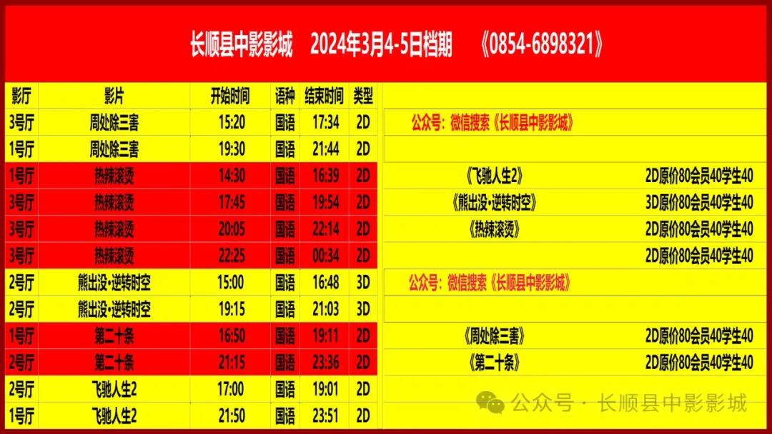 >长顺中影影城3月4-5日档期 招聘收银员多名《周处除三害》《第二十条》《热辣滚烫》《飞驰人生2》《熊出没》热映中......