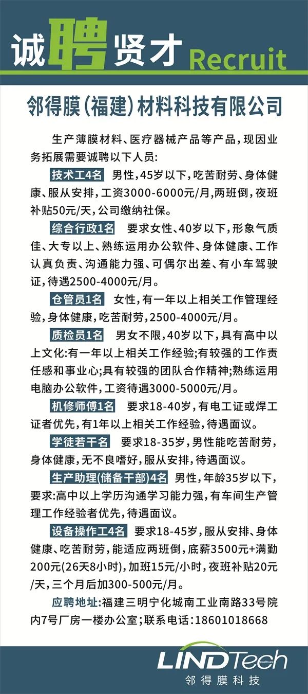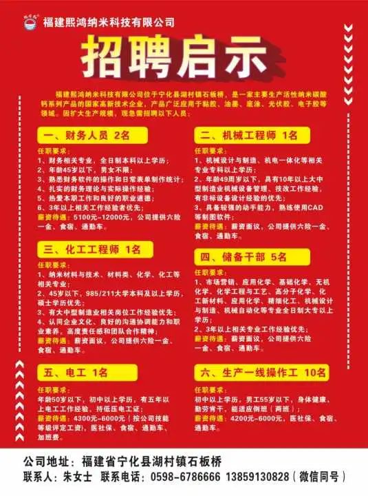 【详情】招聘普工(男)、电工、帮厨、机械工程师、化工工程师...
