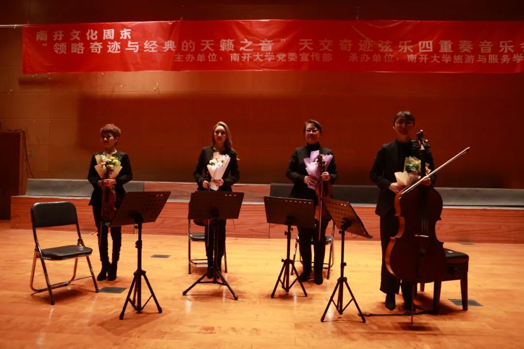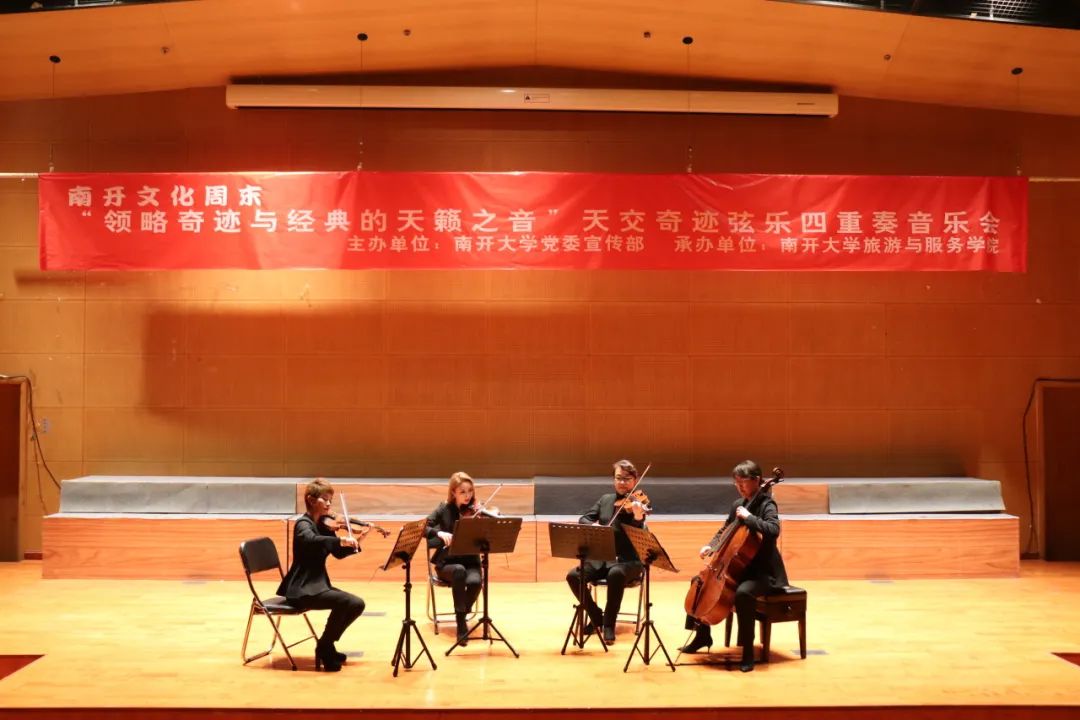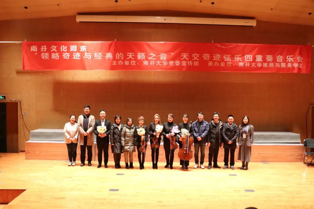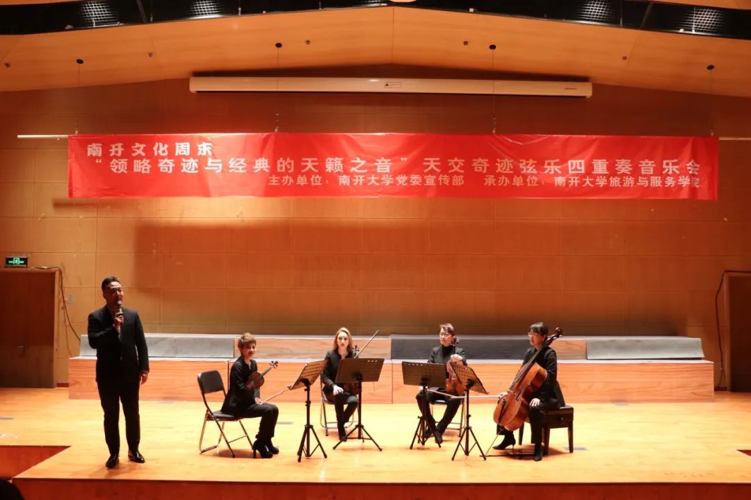 为深入学习贯彻习近平总书记关于宣传思想文化工作的重要指示精神,充分发挥“以文化人”“以美育人”的重要作用,提升青年学生的文化艺术素养,促进高雅艺术进校园,3月2日晚,由党委宣传部主办、旅游与服务学院承办的南开活力周末“领略奇迹与经典的天籁之音”天津交响乐团奇迹弦乐四重奏音乐会在津南校区大通学生中心小音乐厅上演。