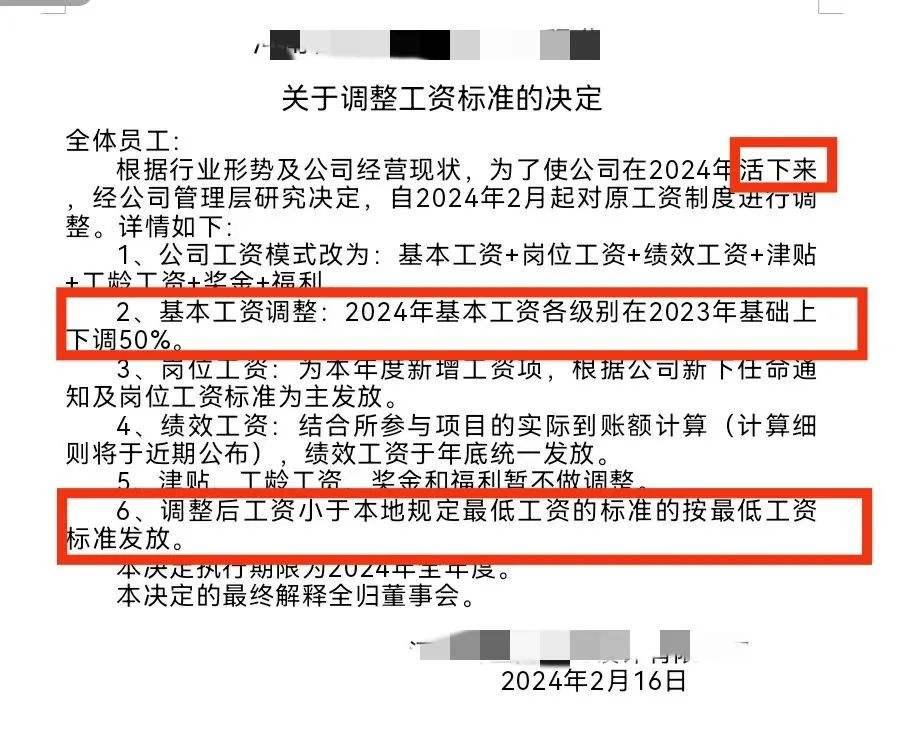 公告里提到的2条“基本工资调整:2024年基本工资各级别在2023年基础上下调50%”,这也看出公司的壮士断腕,不过断的是员工的腕,基本工资砍半,确实扛不住。