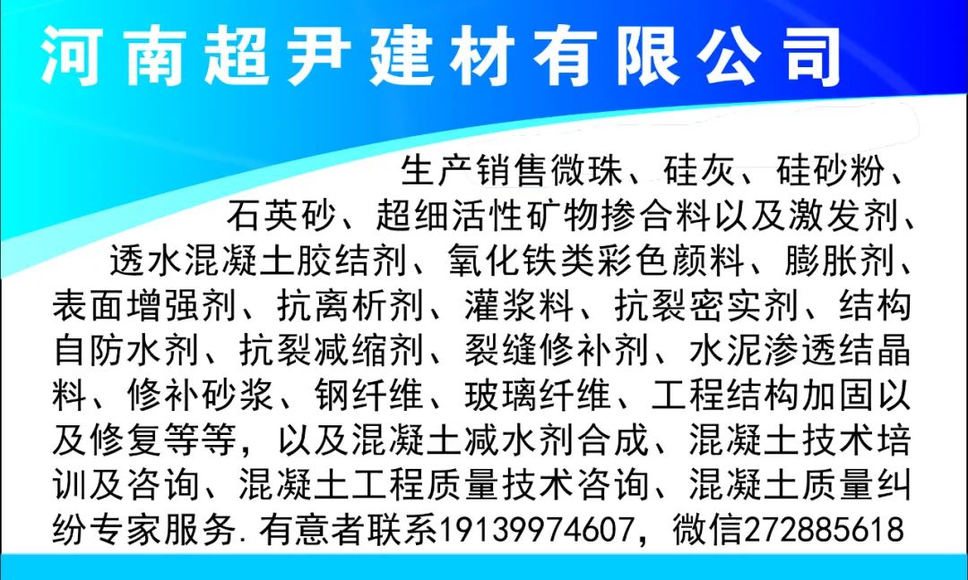 河南超尹建材有限公司主要生产销售微珠、硅灰、超细活性矿物掺合料以及激发剂、抗裂减缩剂、混凝土增强剂、透水混凝土胶结剂、氧化铁类彩色颜料、膨胀剂、表面增强剂、抗离析剂、修补砂浆、钢纤维、工程结构加固以及修复等等,有意者联系19139974607,微信272885618