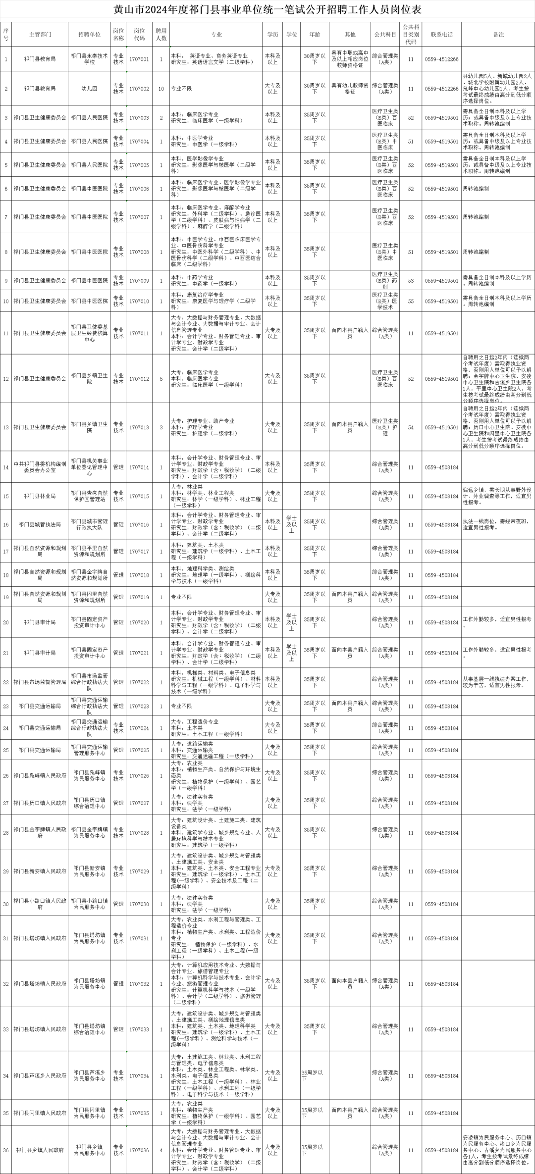 县事业单位有关招聘政策及统考考务、专业测试、考察、体检等后续信息,请考生及时登录祁门县人民政府网站查询、查阅。