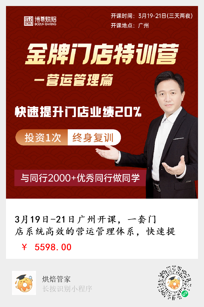 19年的烘焙行业践行,上百家烘焙企业观摩总结,娄孟杰老师整理了一套系统高效的营运管理体系。帮助您:提升门店经营管理能力,快速提升业绩至少20%!