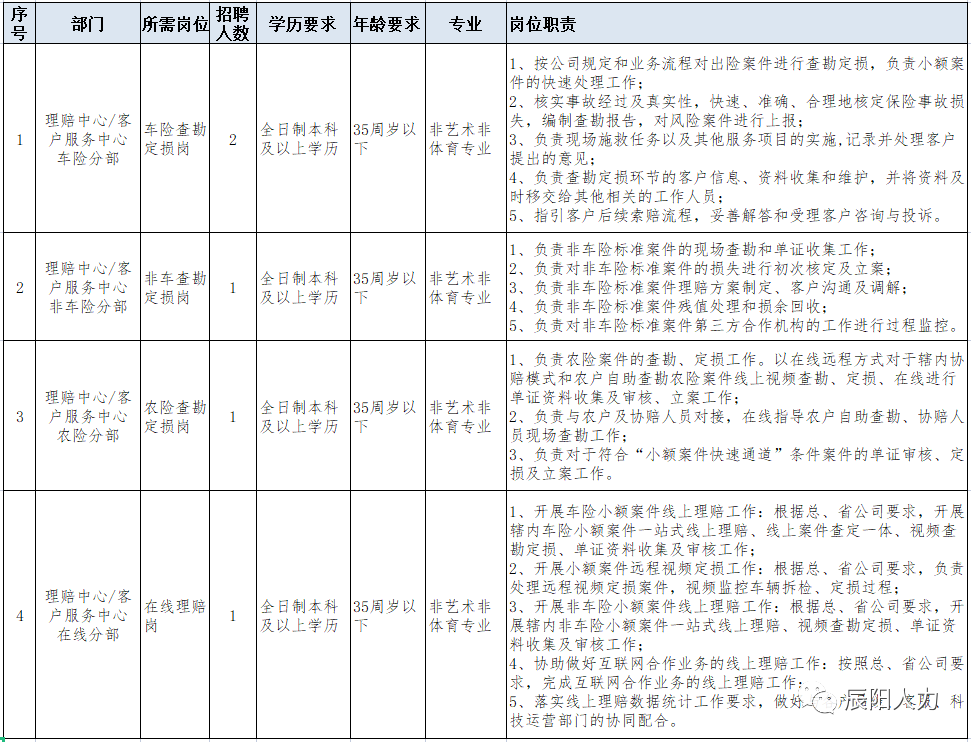 淮北市辰阳人力资源服务公司因工作需要,现向社会公开招聘理赔人员5名,派遣至中国人民财产保险股份有限公司淮北市分公司,现将有关事项公告如下:一、福利待遇