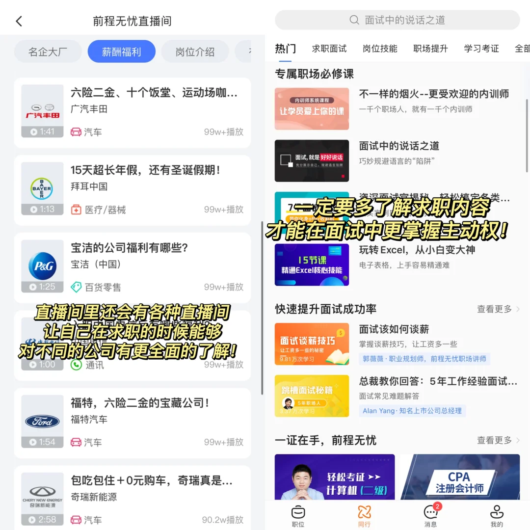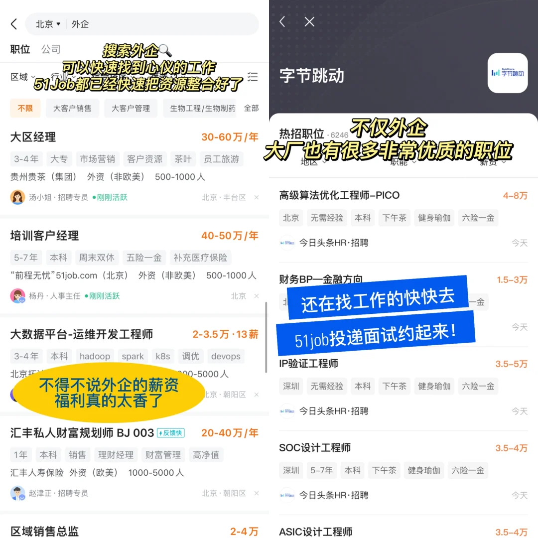 外企打工日记|求职分享 周二好呀大家![派对R] 不知不觉二月也要结束了 好快😭 最近已经进入求职黄金期啦! 正在找工作的小伙伴一定要把握好“金三银四”噢!![赞R] 最近很多宝子私信问我找工作的方法 今天也把我和以及身边朋友在找工作的一些路子分享给大家~[扯脸H] - 🔴投递简历可以选择官网 公主号等官方渠道 或者靠谱的第三方平台!!高效且不会踩坑! 🔵官方渠道直接搜索🔍公司名字➕招聘即可找到。 🟢第三方平台我比较推荐前程无忧!我自己用过且有好朋友在这里工作哈哈哈!!找工作最重要的是掌握好信息差! 1⃣这里汇聚了许多优质雇主 包括各行业百强名企 各种优质职位 都整合好了 结合自身定位选好求职意向后 投递起来很省心! 2⃣还是资源资源资源 这里提供了海量职位!囊括了国企 民企 外企和各种大厂的资源 相当全了![赞R] 3⃣里面还有名企直播间不定时直播 分享各种咨询!可以提前了解公司信息 在面试的时候真的可以不那么被动! 4⃣里面有个薪酬查询的功能我很喜欢📖可以快速了解目前自身岗位在不同行业里的大致薪酬范围 能更快清楚自己的定位!找工作嘛 根据实际情况找到合适的工作是最重要的! ✅分享结束!继续搬砖咯!希望大家在黄金求职季都能找到心仪的工作! #介绍一个小哥哥 #研究生日常 #打工日记 #求职 #招聘 #找工作app推荐 #实习 #职场 #招聘软件哪个好 #校招 #春招 #打工 #职场日常 |