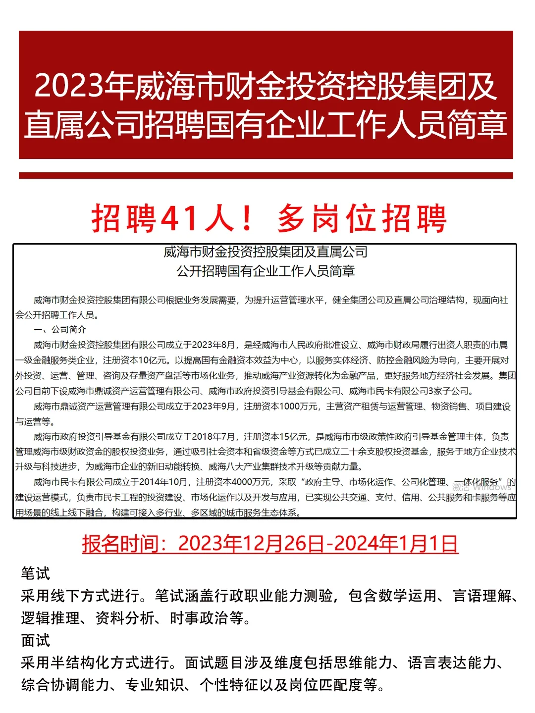 2023年威海市财金投资控股集团及直属公司公开招聘国有企业工作人员简章(41人)