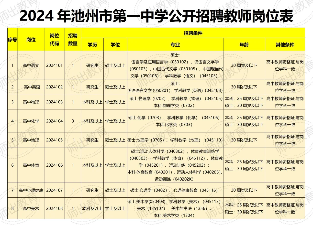 2024年第一波安徽教师招聘公告来了!池州一中招高中教师10人!有编制!报名时间为2024年1月10日08:00至1月16日17:00,笔试科目考《学科专业知识》,笔试时间:2024年1月27日。