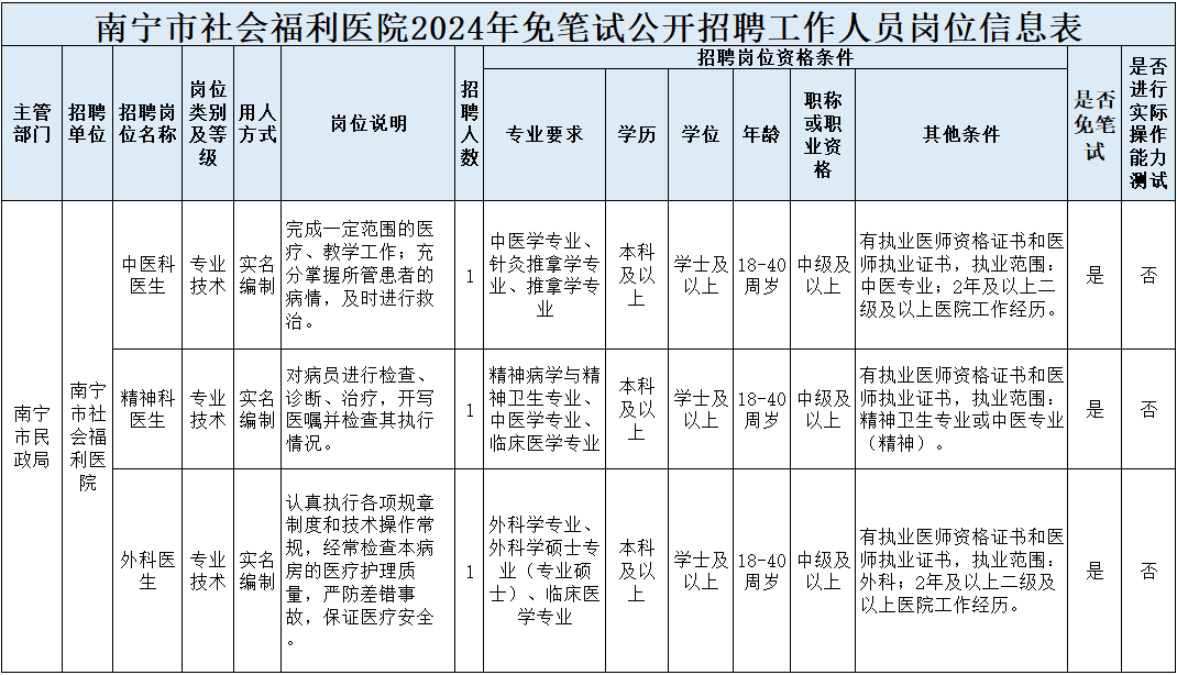1.南宁市社会福利医院2024年免笔试公开招聘工作人员岗位信息表