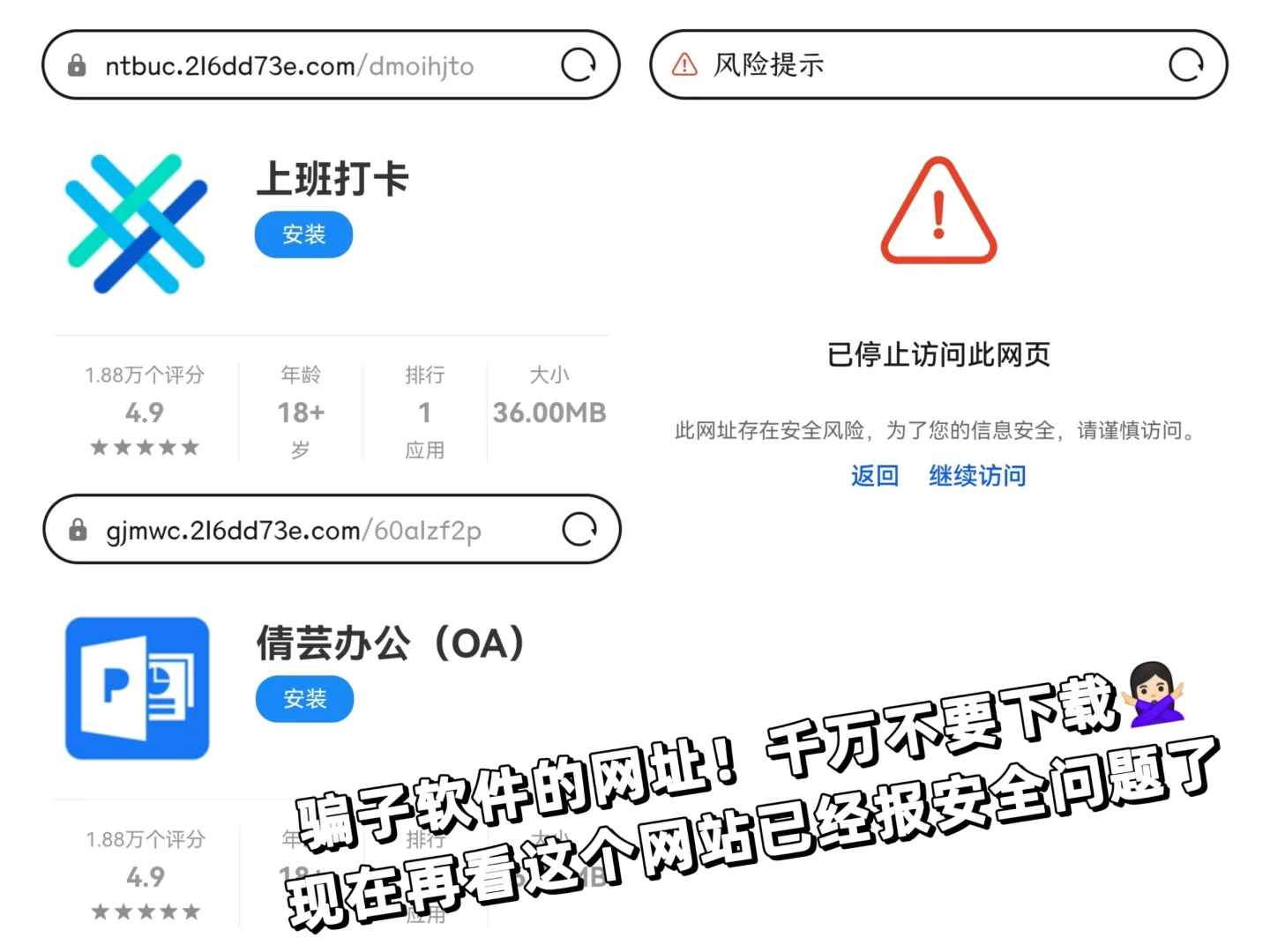 然后开始聊招聘流程,都是先下载他们的内部app试训两天,再安排面试。因为提供的软件都是网址很像诈骗的网址[汗颜R],下载的软件名也像盗版软件[汗颜R],我就怀疑下载了会有病毒,没敢下载,我还跟我妈说我要不要打110问一下[汗颜R]。这时候第二家也给我发招聘流程了,一模一样[惊恐R]!!我当时就确定了,然后小红书搜了一下果然是[扶墙R]!