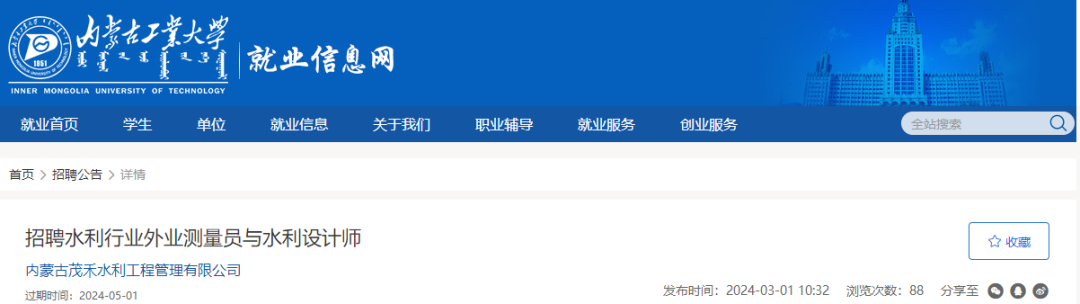 公司简介:公司主要服务水利行业,业务范围包括:呼和浩特、包头,兴安盟,乌兰察布市等区域。专业要求:地理信息系统、遥感与测量等相关专业,主要负责外业测量及相对应的内业制图等工作。工作要求:会熟练开车,有2年以上驾龄,熟悉车辆状况。要求可以熟练使用Office,Arcgis,Cass等软件(至少会office与Arcgis),可以主动学习其他软件。能够接受出差,进行外业测量、收集资料等工作。专业要求:水文水资源,农田水利、水土保持与荒漠化治理、水利工程、给排水、地理信息系统等与水利相关专业均可投递。工作要求:要求可以熟练使用Office,Arcgis,Cass,Origin等水文水利行业软件,学习能力强,适应团队协作,性格开朗。能够接受短期出差,进行项目汇报,对接项目等工作。薪资待遇:本科生实习期三个月,实习期工资3500元,转正工资4500-5000元,实习期后正常缴纳五险一金,签订三年合同;有工作经验人员,根据表现,实习期可缩短,最低一个月,薪资待遇按上述发放;研究生实习期1个月,实习期工资4000元,转正工资5500-6000元,实习期结束后缴纳五险一金;出差吃、住、行按照标准报销,外业补贴一天100元;所有员工独立完成项目有提成,配合完成项目有年终奖金。人员要求:应届毕业生与长期定居呼市人员优先考虑,按照工作要求按时保质完成工作,可以居家办公(呼市),国家节假日正常休息,六日双休,带薪年假,有能力者优先。项目简绍:公司项目随中标情况而定,一般均为水利行业设计服务类项目。联系人:杨先生,添加微信请标注姓名+专业+职业意向+手机号联系电话:18686099357 微信:YangZongYue8517 邮箱:1814262046@qq.com(简历请发邮箱)