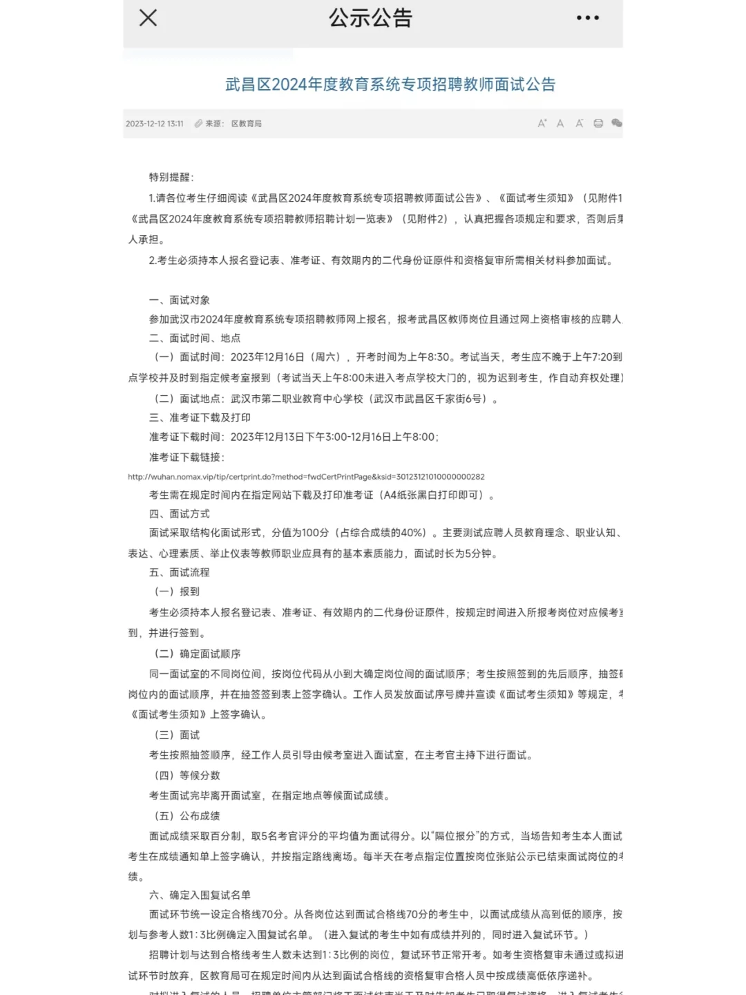 面试地点:武汉市第二职业教育中心学校(武汉市武昌区千家街6号)